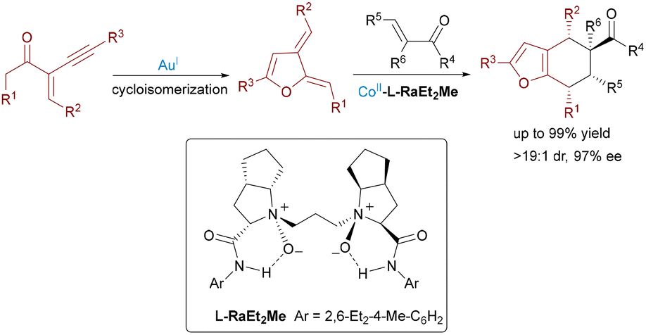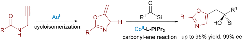 Further advancing the paradigm, Feng's group reported an Au(I)/Co(II) bimetallic system in 2020 for synthesizing chiral tetrahydrobenzofuran derivatives with four contiguous stereocenters (Scheme 5).16 The tandem reaction involved acyclic enynones and electron-deficient olefins, proceeding via gold-catalyzed cycloisomerization to generate furan-based ortho-quinodimethanes, followed by a Co(II)/N,N′-dioxide-mediated enantioselective Diels–Alder cycloaddition. In 2023, Feng leveraged Au(I)/Co(II) catalysis for enantioselective cycloisomerization of N-propargylamides followed by a carbonyl–ene reaction with acylsilanes (Scheme 6).17 This efficient cascade constructed valuable chiral 5-oxazoylmethyl α-silyl alcohols in excellent yields (up to 95%) and enantioselectivities (up to 99% ee) under mild conditions.