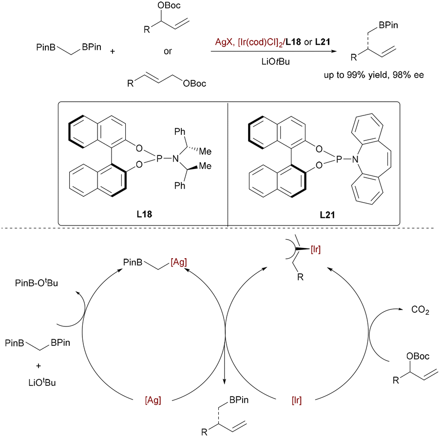 Niu and co-workers performed an iridium-catalyzed enantioselective allylation of bis[(pinacolato)boryl]methane, enabled by silver assistance (Scheme 61).89 Mechanistically, Ag3PO4 facilitates LiOtBu-mediated deborylative transmetallation to generate alkyl–silver species, which then undergoes stereoselective allylic substitution with Ir–π-allyl complexes. Chiral phosphoramidite ligands orchestrate enantiocontrol during C–C bond formation, delivering β-substituted homoallylic boronic esters as versatile chiral building blocks.