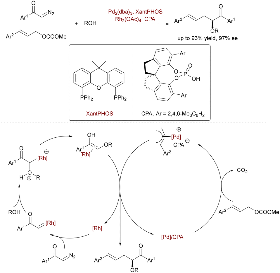 In 2021, Hu et al. developed a ternary Rh/Pd/CPA-catalyzed asymmetric three-component allylic alkylation of α-diazo carbonyls, alcohols, and allyl carbonates (Scheme 64).92 This strategy intercepts the transient Rh-associated enol (derived from an oxonium ylide) with an electrophilic π-allyl-Pd+·CPA− complex via an unprecedented SN1-type trapping pathway. The Xantphos ligand's large bite angle enhances Pd-allyl electrophilicity, suppressing competing O–H insertion, while the chiral phosphoric acid (CPA) controls enantioselectivity (up to 97% ee) through hydrogen bonding and ion-pairing interactions in the stereodetermining C–C bond formation.
