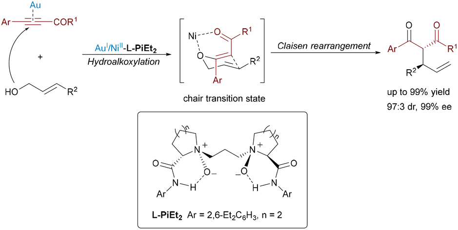 While earlier studies predominantly focused on cascade cyclization, gold-participating dual Lewis acid catalytic systems have also proven to be effective for constructing acyclic architectures through sequential non-cyclization steps. In 2017, Feng and co-workers demonstrated this versatility using an Au(I)/chiral N,N′-dioxide–Ni(II) relay system to enable an asymmetric tandem intermolecular hydroalkoxylation/Claisen rearrangement (Scheme 7).18 The reaction merged alkynyl esters and allylic alcohols under mild conditions, where Au(I) catalyzed the initial hydroalkoxylation to form allyl vinyl ether intermediates, while the chiral N,N′-dioxide–Ni(II) complex stereocontrolled the subsequent [3,3]-sigmatropic rearrangement. This strategy efficiently suppressed thermal background reactions and prevented epimerization, delivering acyclic α-allyl-β-keto esters with exceptional stereoselectivity (up to 99% ee, 97