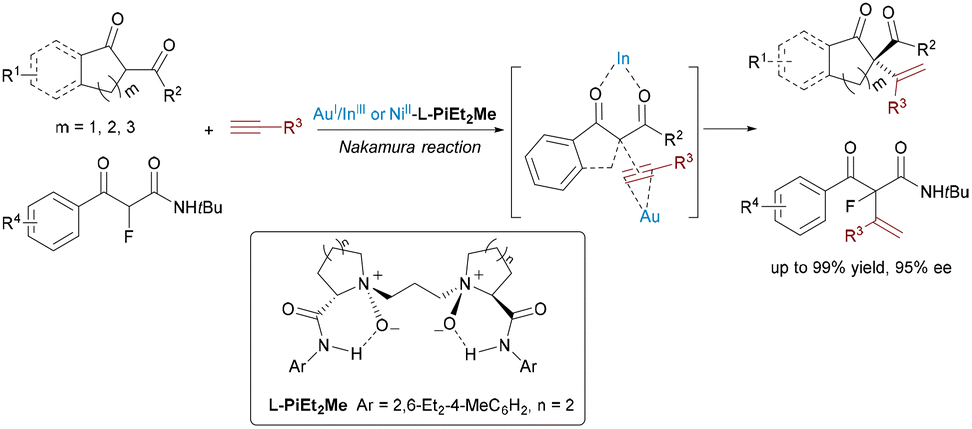 Expanding the sequential non-cyclization strategy in 2021, Feng's group achieved the first catalytic asymmetric Nakamura reaction via synergistic Au(I)/chiral N,N′-dioxide–In(III) or Ni(II) catalysis (Scheme 8).19 The system employed Au(I) to activate unactivated 1-alkynes and chiral In(III) or Ni(II) to generate enolates from 1,3-dicarbonyl compounds. Precise ligand tuning enabled enantiocontrol (up to 97.5