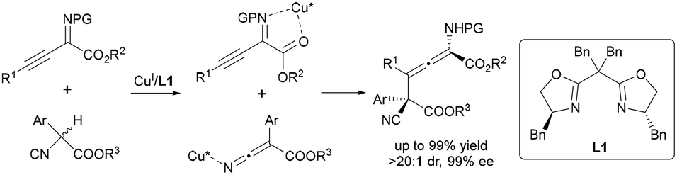 Zhang's breakthrough employs a single chiral Cu(I)-bis(oxazoline) catalyst to synthesize tetrasubstituted α-amino allenoates with vicinal all-carbon quaternary stereocenters (Scheme 9).20 This strategy employs a single chiral Cu(I)-BOX complex to dynamically activate two distinct substrates through a substrate-responsive mechanism: first, the Cu(I) center coordinates and polarizes the alkyne moiety of 1-alkynyl ketimines, enhancing the electrophilicity of the γ-position; subsequently, the same catalyst promotes deprotonation of α-substituted cyanoacetates to generate a reactive enolate intermediate. Crucially, the rigid chiral pocket of the BOX ligand enforces γ-regioselectivity (up to >20