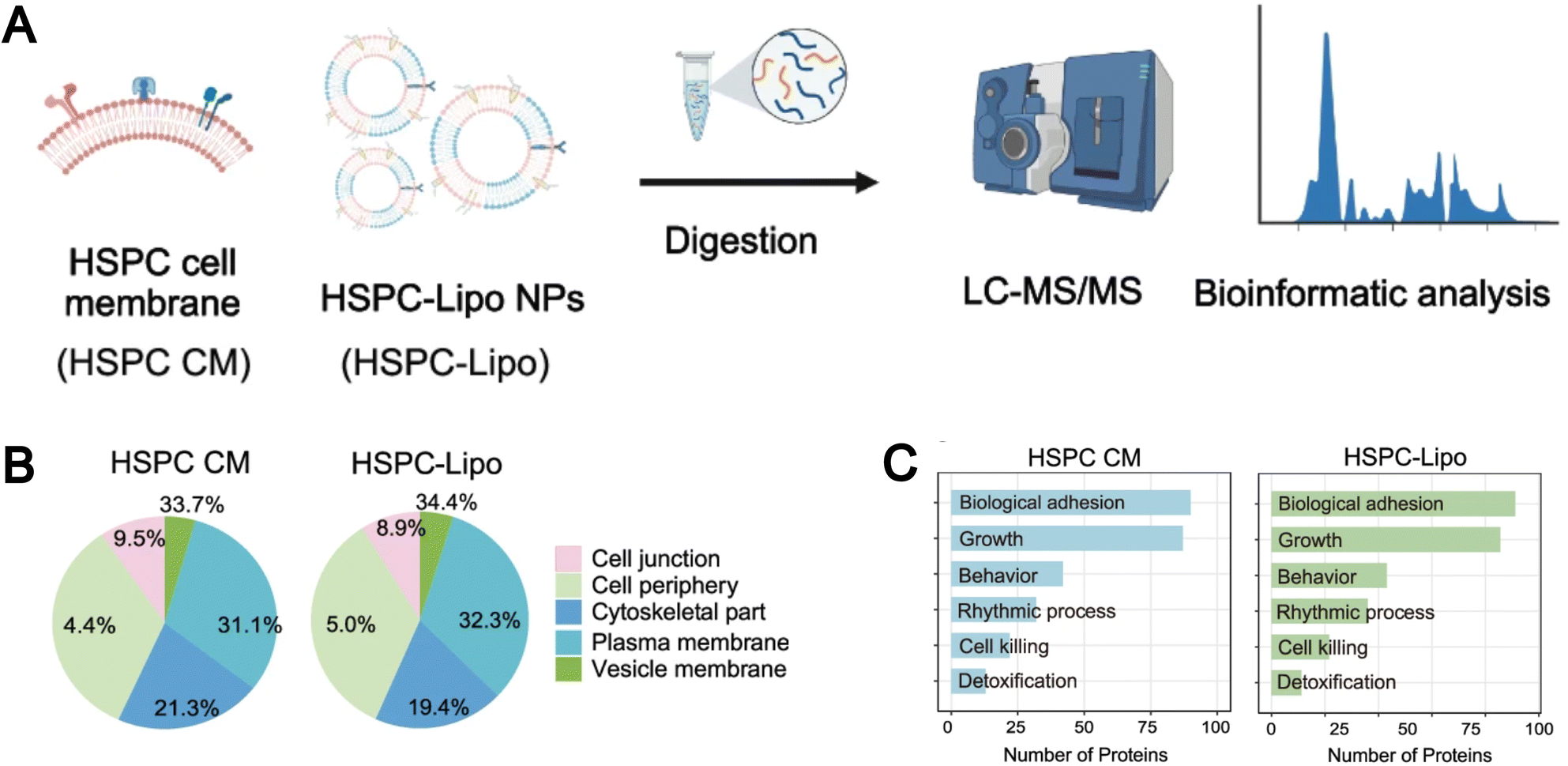 300. Proteomic analysis of the leukosome demonstrated that its membrane primarily consists of integral or lipid-anchored proteins, cytoskeletal and junctional proteins, peripheral proteins, as well as vesicular or secreted proteins. Functionally, these proteins participate in a variety of biological processes, including transport, signal transduction, immune response, cell adhesion, lipid metabolism, and structural maintenance. Compared to the “Top-down” approach, biomimetic liposomes prepared using the “Bottom-up” method better preserve the integrity and functionality of the cell membrane protein. For example, Li et al. found that biomimetic hematopoietic stem and progenitor cell membrane incorporated liposomes (HSPC-Lipo) prepared using the thin-film hydration method exhibited a similar classification and proportion of protein subtypes as their parent HSPC cell membrane through mass spectrometry analysis (Fig. 10A).138 Interestingly, pathway enrichment analysis revealed that despite undergoing multiple freeze–thaw cycles and fusion with liposomes, HSPC-Lipo vesicles retained and enriched gene expressions and signaling pathways like those of the HSPC cell membrane, particularly pathways related to cell adhesion (Fig. 10B and C).