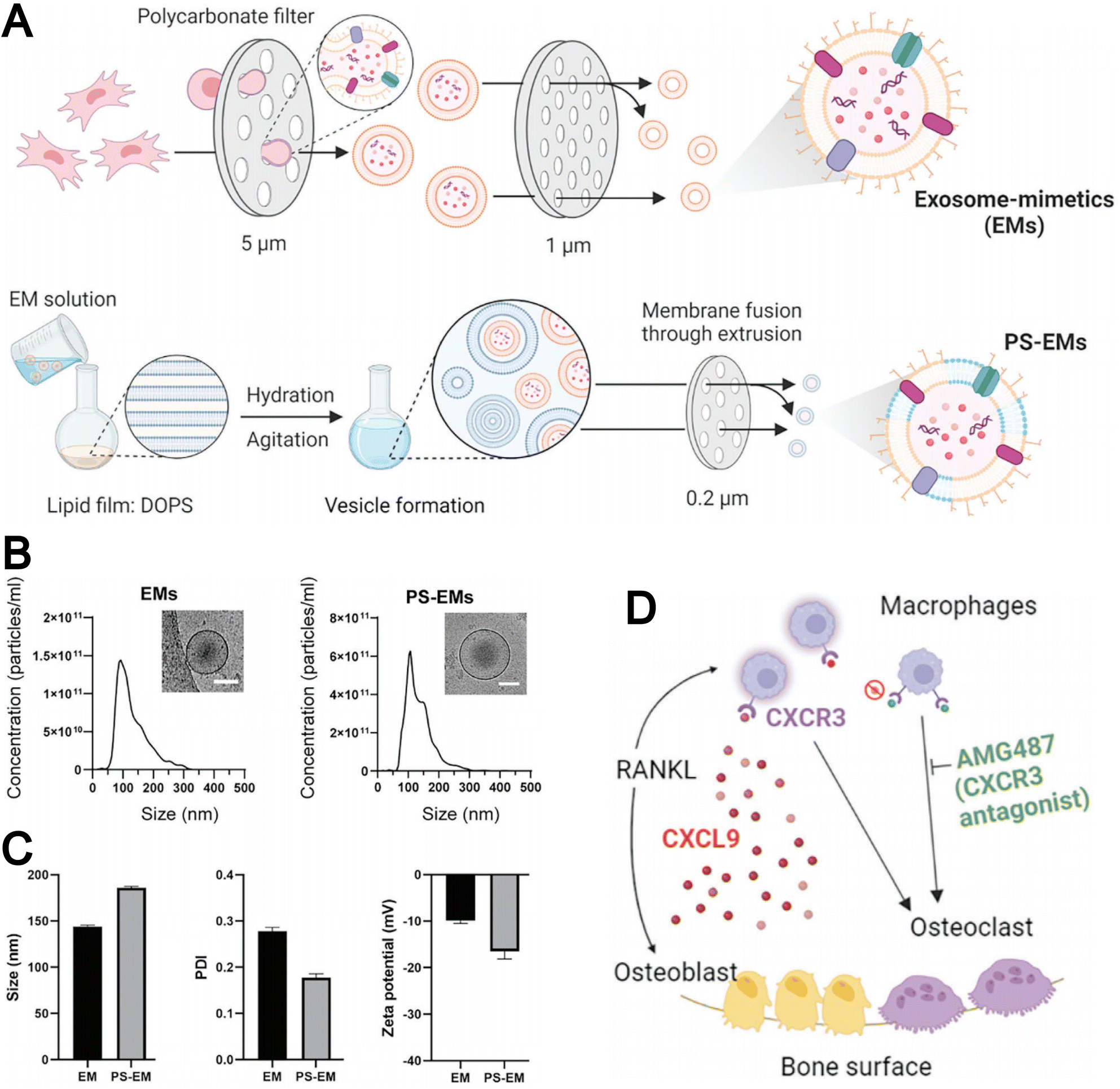 | Fig. 11 (A) Schematic illustration of the procedure for generating exosome mimetics (EMs) and phospholipid-incorporated EMs (PS-EMs). (B) Size distribution of EMs and PS-EMs revealed by nanoparticle tracking analysis (NTA) with representative cryo-TEM images on top. (C) Size, polydispersity index, and zeta potential of EMs and PS-EMs. (D) Schematic depicting chemokine control of osteoclast recruitment via the CXCL9-CXCR3 axis. Receptor activator for NF-kB ligand (RANKL), either directly or indirectly, induces the release of CXCL9 from osteoblast progenitors, which activates macrophages expressing the CXCR3 receptor. This activation triggers macrophage recruitment and differentiation into osteoclasts, contributing to bone resorption. Reproduced from ref. 73 with permission from Wiley-VCH, copyright (2024). | ||