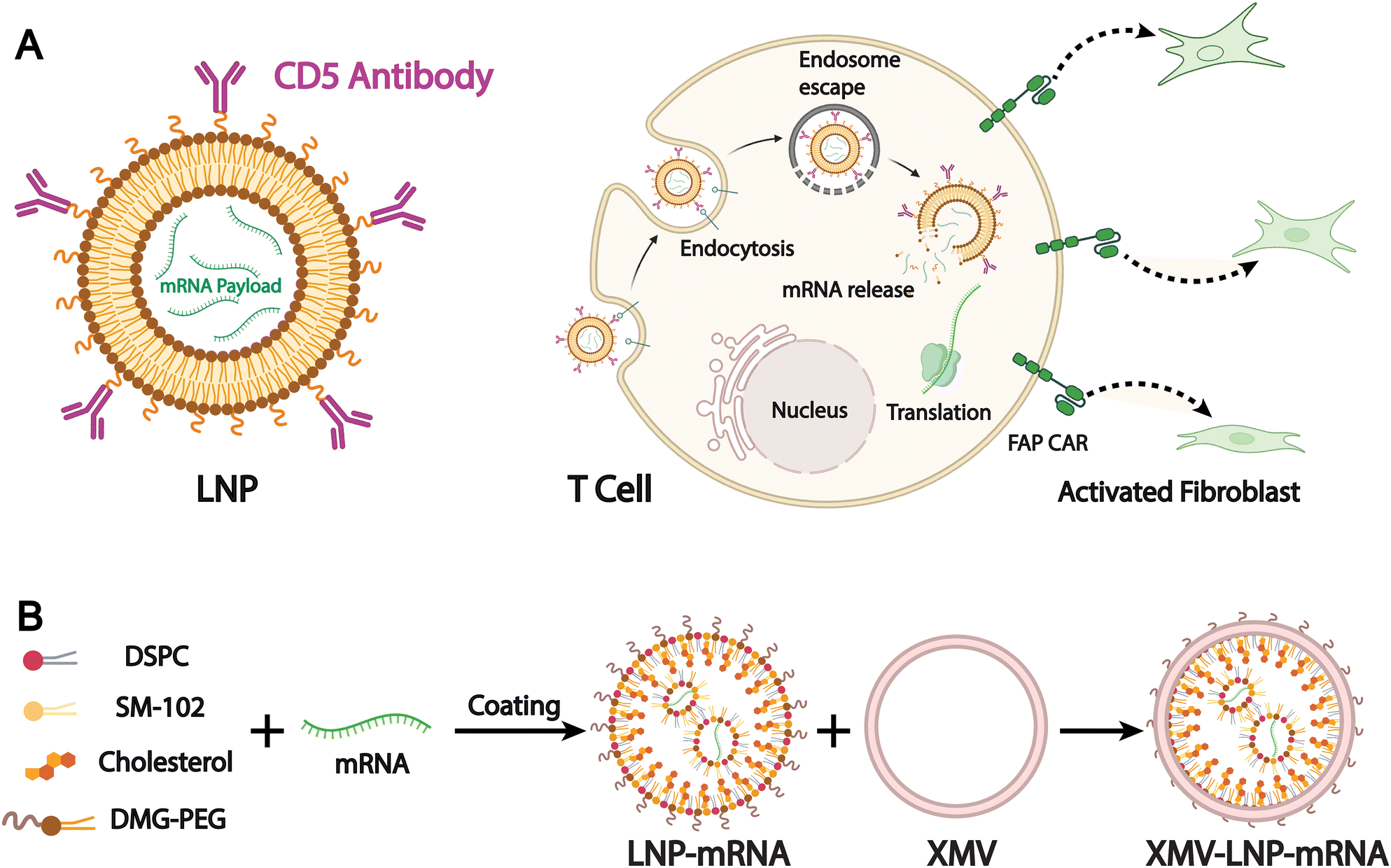 | Fig. 12 (A) Schematic outlining the molecular process to create transient FAPCAR T cells using CD5-targeted LNPs. Adapted from ref. 152 and created with BioRender.com. (B) A schematic illustration of the preparation of XMV coating on the LNP-mRNA surface to generate XMV-LNP-mRNA. Adapted from ref. 153 2025 and created with BioRender.com. | ||