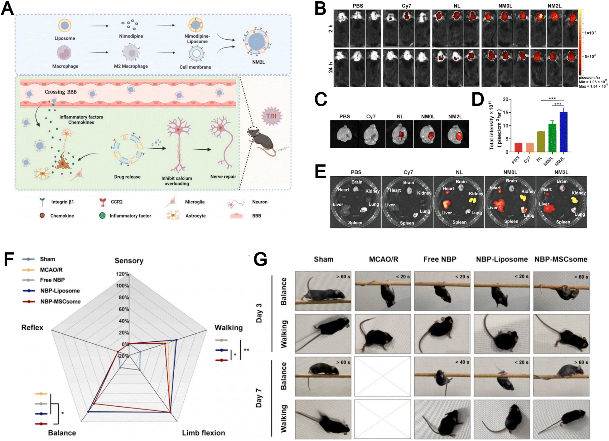 Liposomes face significant challenges in treating brain-related diseases such as traumatic brain injury (TBI) and ischemic stroke because the blood–brain barrier (BBB) limits their brain penetration and non-specific accumulation in other organs lowers targeting efficiency. The emergence of biomimetic liposomes has helped overcome some of these difficulties. For example, Zhang et al. designed M2 macrophage membrane-hybrid biomimetic liposomes loaded with nimodipine (NM2Ls), a Ca2+ influx inhibitor (Fig. 13A).104 Experimental results demonstrated that intravenous administration of NM2Ls allowed them to evade immune clearance and to target the brain through CCR2 (Fig. 13B–D), while reducing liposome accumulation in other organs (Fig. 13E), which significantly alleviated brain inflammation in a TBI mouse model. The authors confirmed that NM2Ls prepared by employing a biomembrane strategy could act as promising brain-targeted therapeutics with considerable potential. Their study highlights that leveraging M2 macrophage membranes to construct biomimetic liposomes offers an effective strategy to achieve brain-targeted delivery and underscores the therapeutic potential of biomimicry in treating neurological diseases.