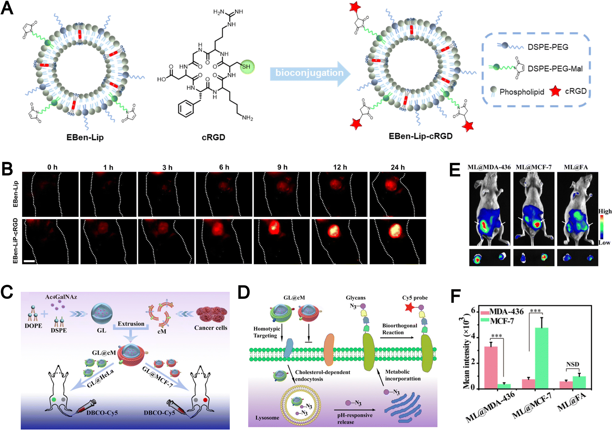 Biomimetic liposomes, endowed with favorable disease-targeting and immune-evasive characteristics, have emerged as promising platforms in the field of biomedical imaging. To enhance tumor-specific accumulation, click chemistry has been employed to conjugate the tumor-targeting peptide cRGD onto the surface of fluorescent probe–loaded liposomes, thereby improving their active targeting ability (Fig. 15A).88 While passive accumulation via the EPR effect contributes to tumor localization, the incorporation of cRGD further enhances targeting precision. In vivo imaging studies demonstrated that mice treated with EBen-Lip-cRGD exhibited significantly stronger NIR-II fluorescence at tumor sites compared to non-modified controls (Fig. 15B). These results highlight the potential of fluorescent liposomes modified with tumor-targeting peptides (such as cRGD) as efficient imaging agents for tumor visualization.