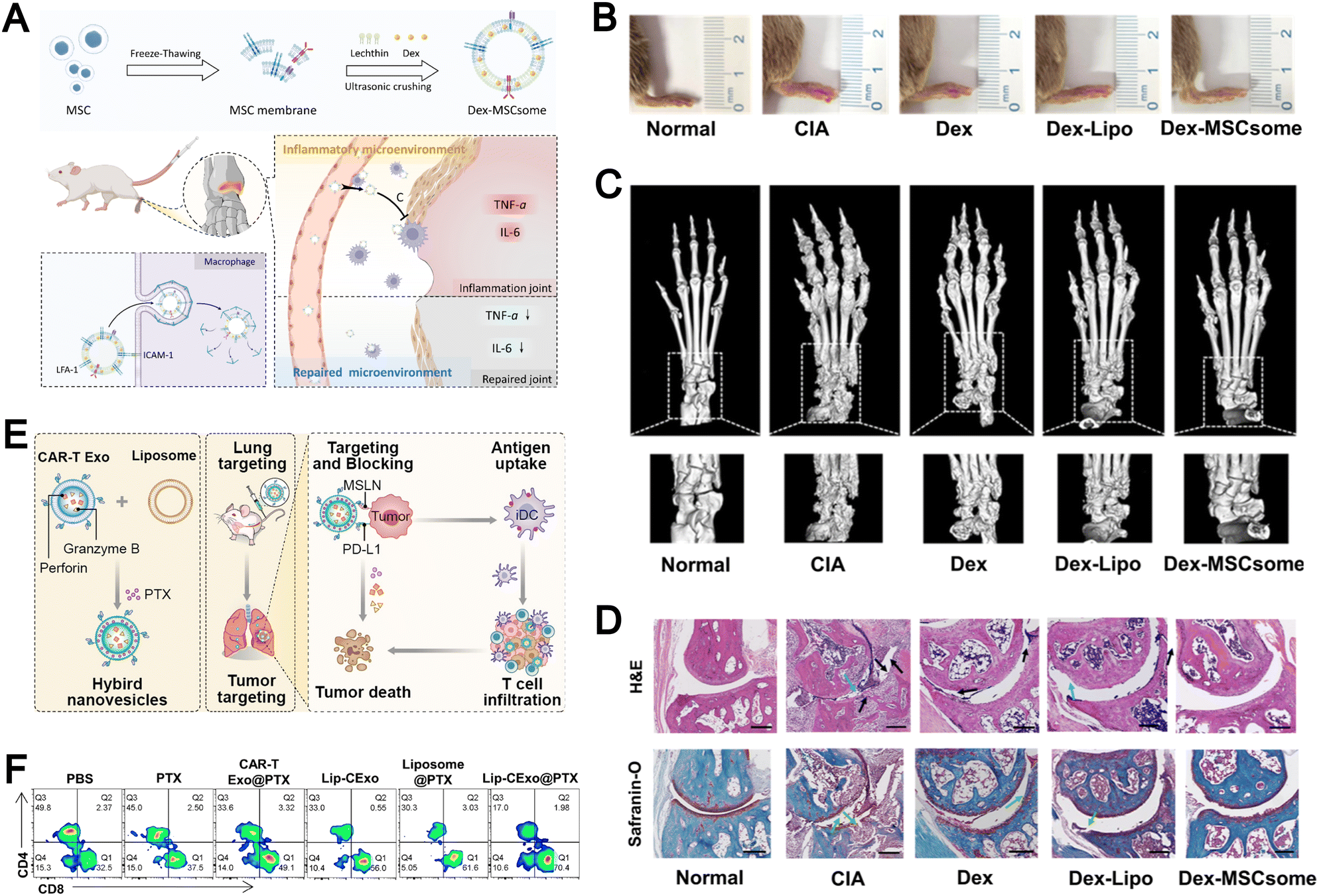 | Fig. 16 (A) Schematic diagram of rheumatoid arthritis (RA) treatment using mesenchymal stem cell (MSC) membrane-based bionic carriers. (B) Morphology of the right hind paw of the five groups on day 53. (C) Micro-CT images of the right hind paw of the five groups on day 53. (D) Hematoxylin and eosin (H&E) staining and safranin O-fast green staining in the five groups. Black arrow indicates synovial hyperplasia, blue indicates inflammatory cell infiltration, green arrow indicates cartilage destruction, bar: 100 µm. Reproduced from ref. 163 with permission from the American Chemical Society, copyright (2024). (E) Schematic illustration of hybrid nanovesicles of bispecific CAR-T cell-derived exosomes and liposomes for lung cancer chemical-immunotherapy. (F) Representative flow cytometry plots of mature DCs in the tumor microenvironment for different treatment groups (n = 3). Reproduced from ref. 116 with permission from the American Chemical Society, copyright (2023). | ||