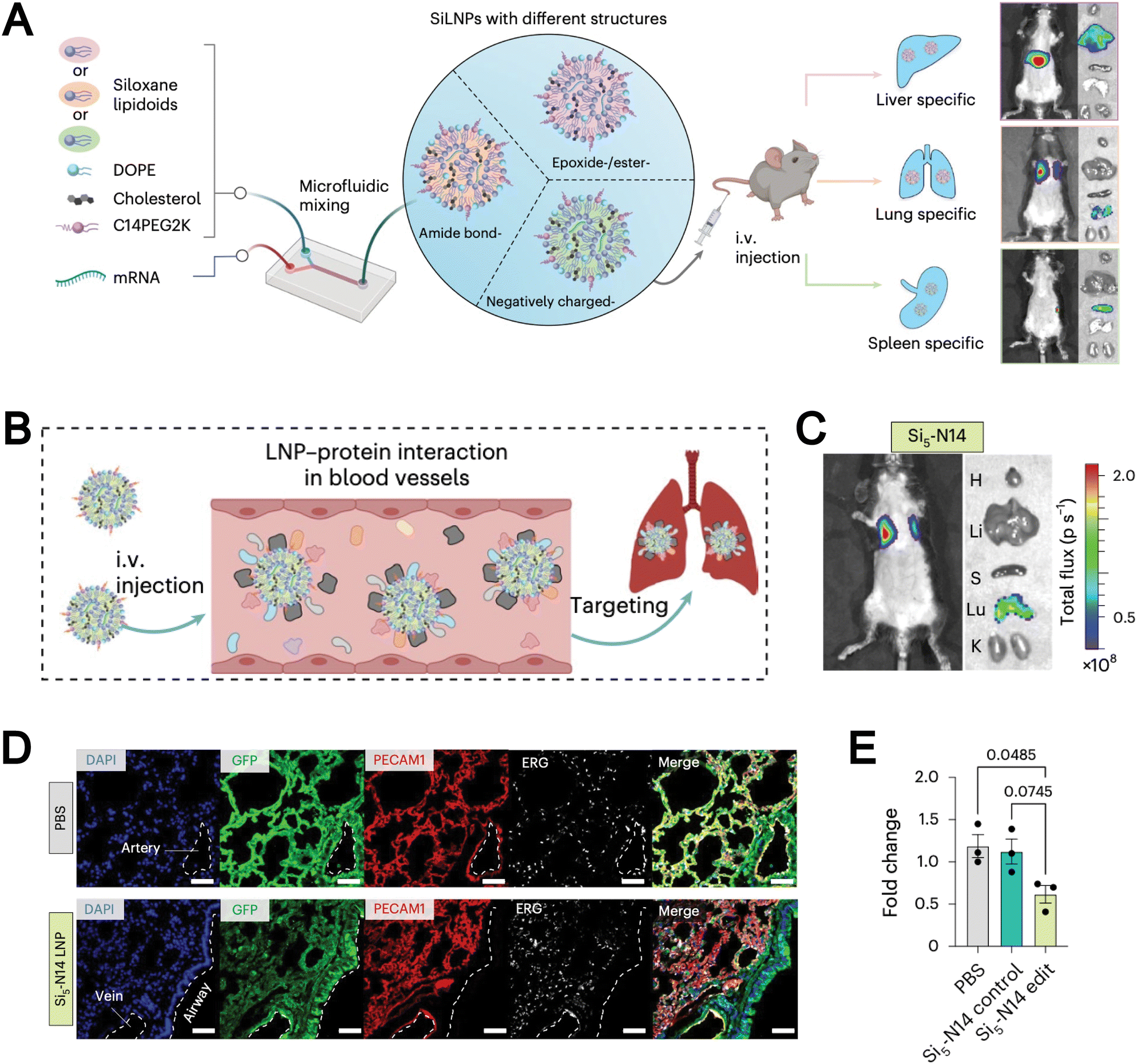 | Fig. 17 (A) SiLNPs were formulated using a microfluidic mixing device each with a siloxane-incorporated lipidoid, helper lipid (DOPE), cholesterol and PEG-lipid (C14PEG2K). The resulting SiLNPs with different siloxane-incorporated lipidoid structures mediate in vivo tissue-specific mRNA delivery to the liver, lungs and spleen. (B) Schematic representation of the interaction of Si5-N14 LNPs with proteins in blood vessels. (C) Luciferase expression imaging from Si5-N14 LNPs 6 h post-injection (FLuc mRNA, 0.3 mg kg−1). (D) Representative immunostaining showed GFP knockout in lung ECs. (E) RT-qPCR analysis of GFP in sorted ECs. Reproduced from ref. 70 with permission from Springer Nature, copyright (2025). | ||