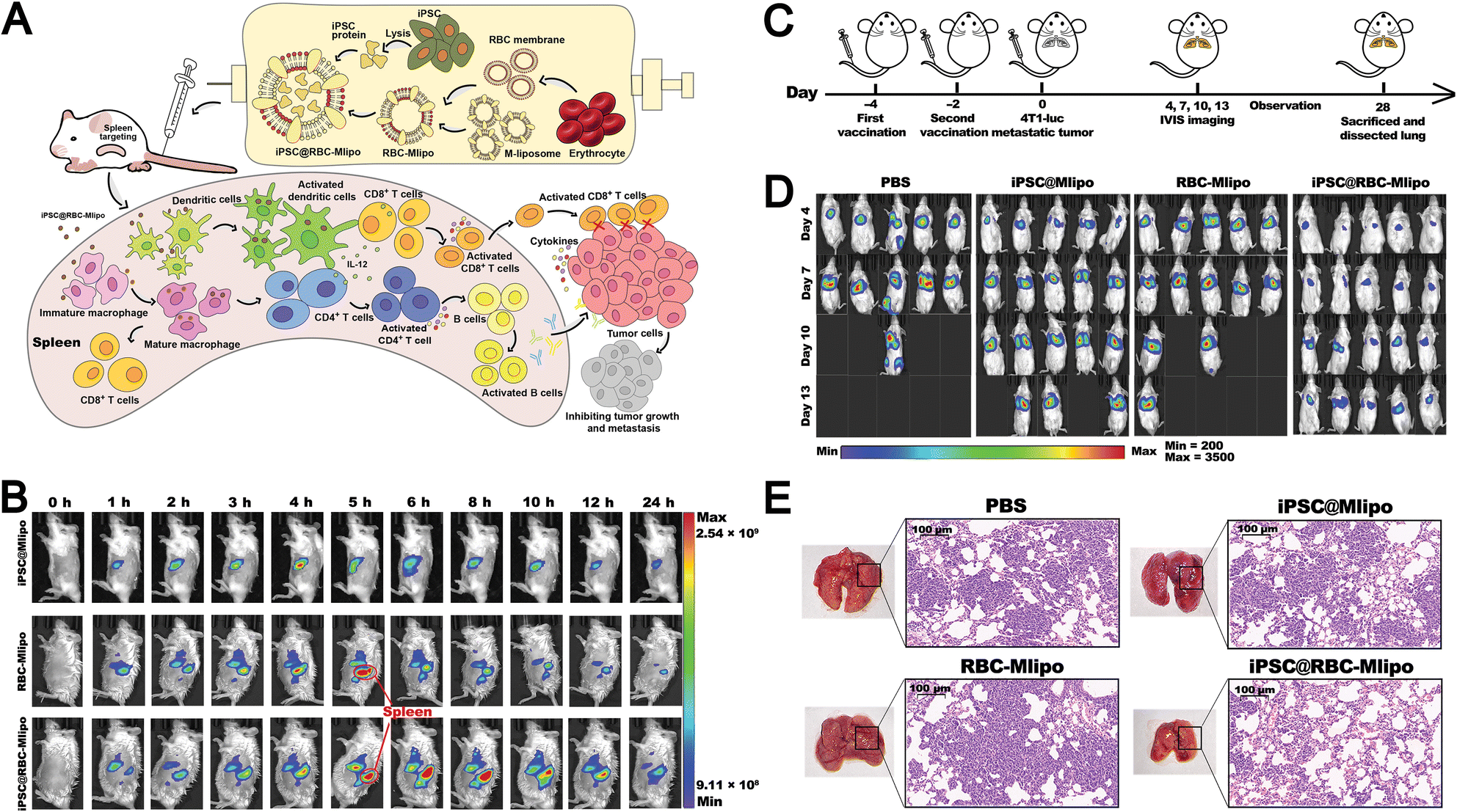 Currently, tumor vaccines still face challenges such as the lack of versatility and effective immune induction. To overcome these issues, particularly the problem of insufficient drug loading capacity, Zhai et al. developed biomimetic liposomes fused with erythrocyte membranes using modified lipid materials. This nanovaccine encapsulates induced pluripotent stem cell (iPSC) proteins, targets the spleen, and robustly activates systemic tumor-specific immunity (Fig. 18A).167 The authors found that RBC-Mlipo and the nanovaccine iPSC@RBC-Mlipo, after fusion with erythrocyte membranes, showed obvious accumulation in the spleen 2 hours after intravenous injection, and the fluorescence signal could be continuously monitored for up to 10 hours (Fig. 18B). To evaluate the antimetastatic potential of the nanovaccine iPSC@RBC-Mlipo, the authors intravenously injected 4T1-luc cells into mice after two vaccinations with iPSC@RBC-Mlipo to mimic the metastatic process of cancer cells (Fig. 18C). In vivo bioluminescence imaging showed that, compared with mice in the PBS group, iPSC@Mlipo group, and RBC-Mlipo group, those vaccinated with iPSC@RBC-Mlipo exhibited weaker fluorescence signals, indicating that the nanovaccine could further delay tumor growth and metastasis (Fig. 18D). The authors also found that the antimetastatic effect of the nanovaccine was reflected in fewer pulmonary tumor nodules and more normal lung volumes observed after the mice were sacrificed. H&E staining further confirmed these findings by revealing structural differences in pulmonary nodules among the groups (Fig. 18E). The biomimetic fusion of erythrocyte membranes with liposomes allows targeted delivery of iPSC proteins to the spleen, activates systemic tumor-specific immunity, and inhibits tumor growth and metastasis, highlighting the advantage of biomimicry for the design of potent and organ-targeted nanovaccines.