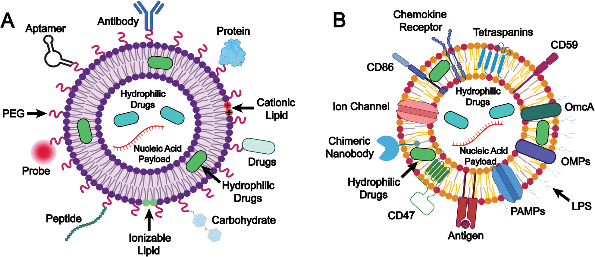 Liposomes are small, spherical vesicles composed of one or more phospholipid bilayers enclosing an aqueous core.16,17 They can encapsulate a diverse range of therapeutic agents, including small molecules, peptides, proteins, and nucleic acids. Many conventional drugs undergo chemical modification to enhance their lipophilicity, which improves their encapsulation efficiency and retention within the liposome and increases the overall formulation stability.18,19 Such modifications not only facilitate effective drug loading but also help maintain therapeutic concentrations over extended periods, conferring controlled drug release and improving pharmacokinetic profiles.20 These strategies demonstrate the versatility of liposomes as a platform for diverse therapeutic modalities, from conventional small molecules to more complex biologics. Liposomes can not only protect their cargo from degradation in the bloodstream, enhancing pharmacokinetics and therapeutic efficacy, but also reduce the systemic toxicity.21 Moreover, the enhanced permeability and retention (EPR) effect enables liposomes to preferentially accumulate at tumor sites, which leads to increased drug release and deeper tumor penetration.22,23 Consequently, most FDA-approved cancer nanomedicines are liposome-based formulations. However, these liposomal vesicles face several biological barriers that limit their optimal biodistribution and therapeutic efficacy. A primary challenge is that, as foreign entities, liposomes are readily recognized and cleared by the mononuclear phagocyte system (MPS).24–26 Moreover, the lack of intrinsic active targeting mechanisms often results in off-target accumulation, potentially causing adverse effects on healthy tissues and cells. Additionally, traditional liposomes have been used exclusively as drug carriers and lack multifunctionality, which further limits their development and clinical translation.