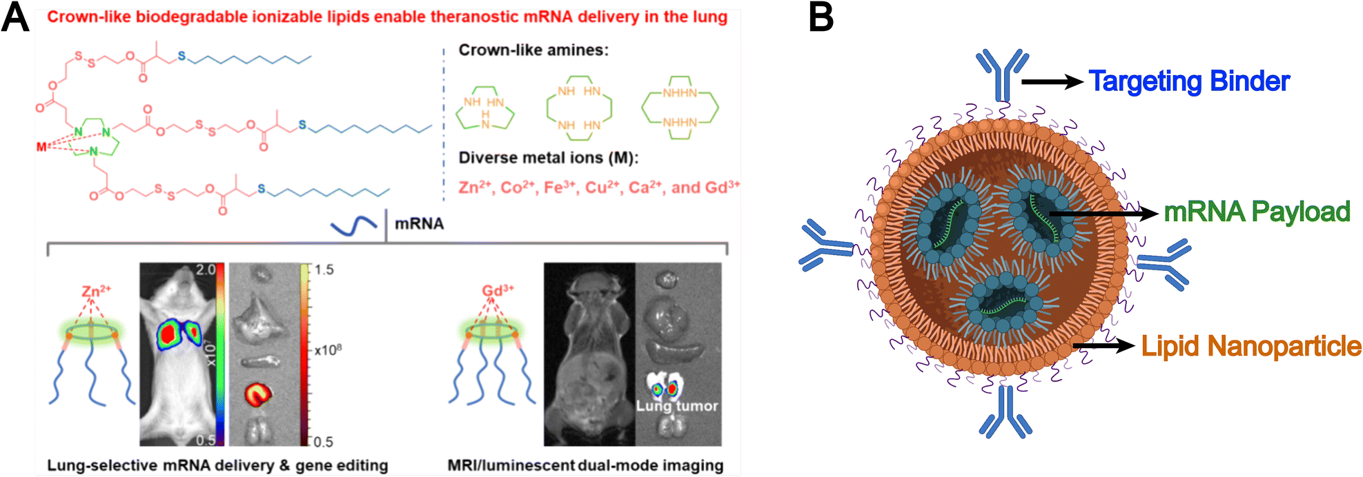 | Fig. 3 (A) Chemical structures of corona-shaped biodegradable ionizable lipid, and their application in targeted mRNA delivery/imaging to the lungs. Reproduced from ref. 78 with permission from the American Chemical Society, copyright (2024). (B) Schematic representation of a targeted lipid nanoparticle. Image adapted from ref. 79, Hunter et al., 2025 and created with BioRender.com. | ||