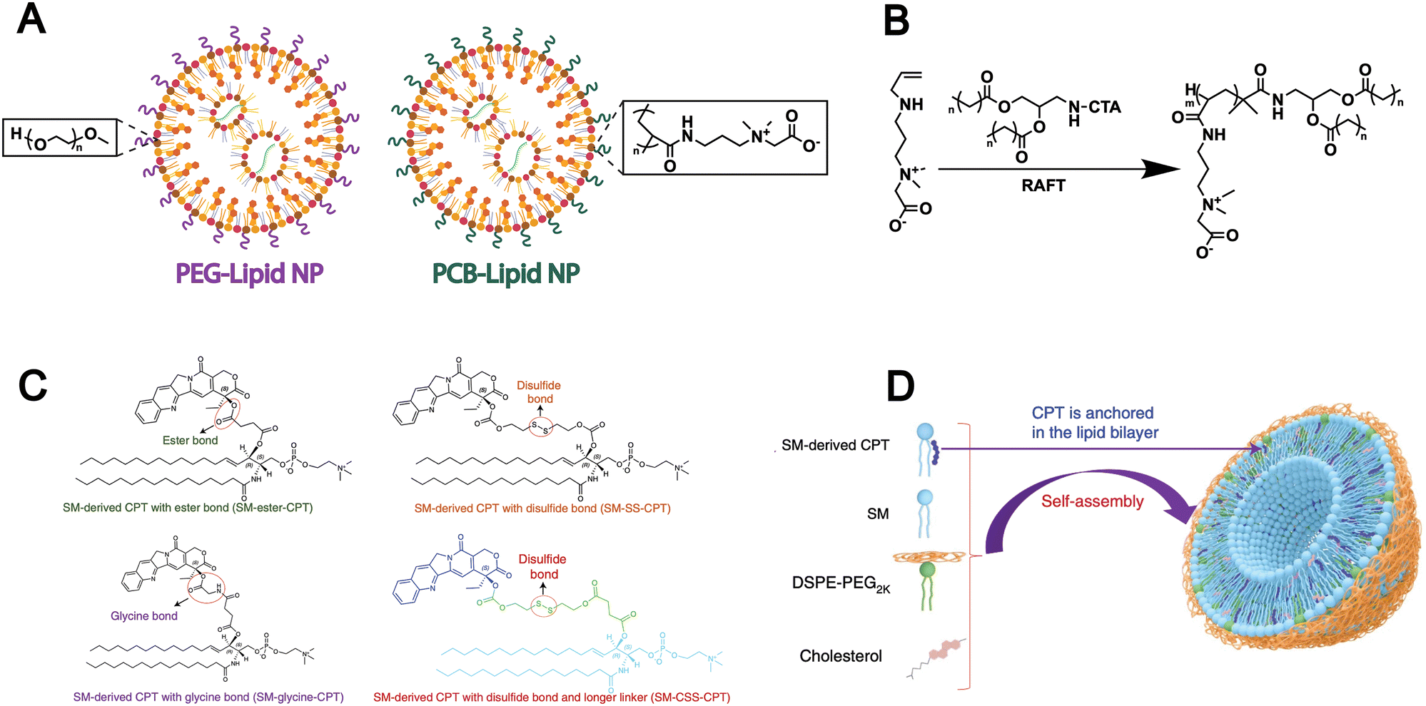 | Fig. 4 (A) Schematic of this work, where PEG-lipid was fully replaced by PCB-lipid in the LNP-containing ionizable cationic lipid, phospholipid, cholesterol and mRNA cargo. (B) Reversible addition–fragmentation chain transfer polymerization (RAFT) was used to synthesize different variants of PCB-lipids with different average carboxybetaine repeat units (m = ∼5, m = ∼15 or m = ∼27) and different acyl chain lengths (n = 12 or n = 16). Adapted from ref. 86 and created with BioRender.com. (C) Conjugation of SM and CPT resulted in SM-derived CPTs with either an ester bond (SM-ester-CPT), a disulfide linkage (SM-SS-CPT), a glycine bond (SM-glycine-CPT), or a disulfide linkage and a longer linker (SM-CSS-CPT). (D) Schematic depicting the self-assembly of SM-CPT into a camptothesome. Reproduced from ref. 9 with permission from Springer Nature, copyright (2021). | ||
