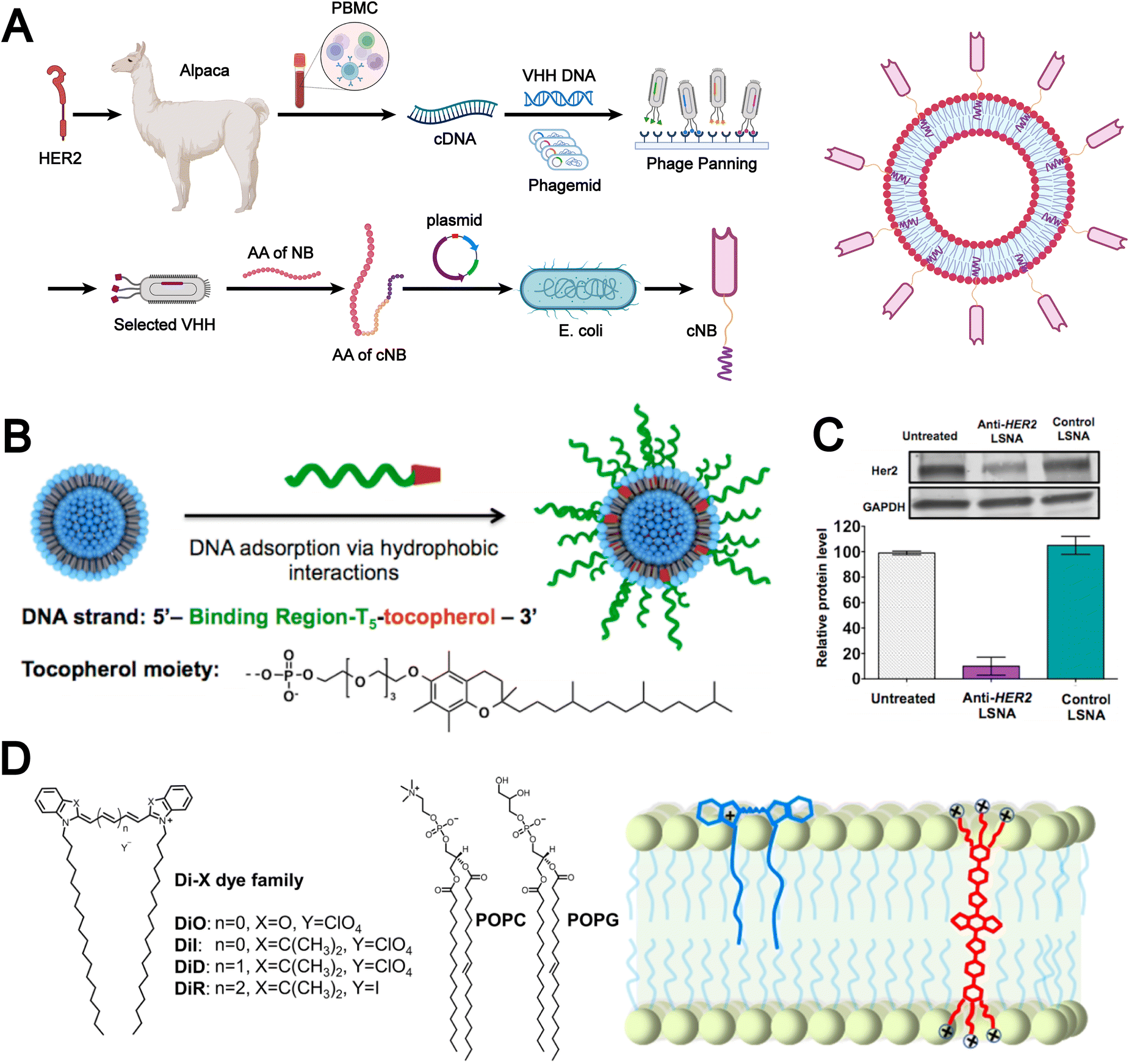 | Fig. 5 (A) Flowchart illustrating the manufacturing processes of chimeric nanobody (cNB) and its liposomal platform (cNB-LP). Adapted from ref. 36and created with BioRender.com. (B) Assembly of liposomal spherical nucleic acids (SNAs) from DOPC small unilamellar vesicles (SUVs) and tocopherol-modified DNA. (C) Human epidermal growth factor receptor 2 (HER2) gene knockdown in SKOV-3 cells using anti-HER2 liposomal SNAs. Reproduced from ref. 87 with permission from the American Chemical Society, copyright (2014). (D) Chemical structures of the Di family of carbocyanine dyes alongside representative phospholipids, neutral phospholipid 1-palmitoyl-2-oleoyl-glycero-3-phosphocholine (POPC) and negatively charged 1-palmitoyl-2-oleoyl-sn-glycero-3-phospho-(1′-rac-glycerol) sodium (POPG) (left). Schematic illustration showcasing the binding of DiR and conjugated electrolytes (CE) to the lipid membrane (right). Reproduced from ref. 88 with permission from Wiley-VCH, copyright (2024). | ||