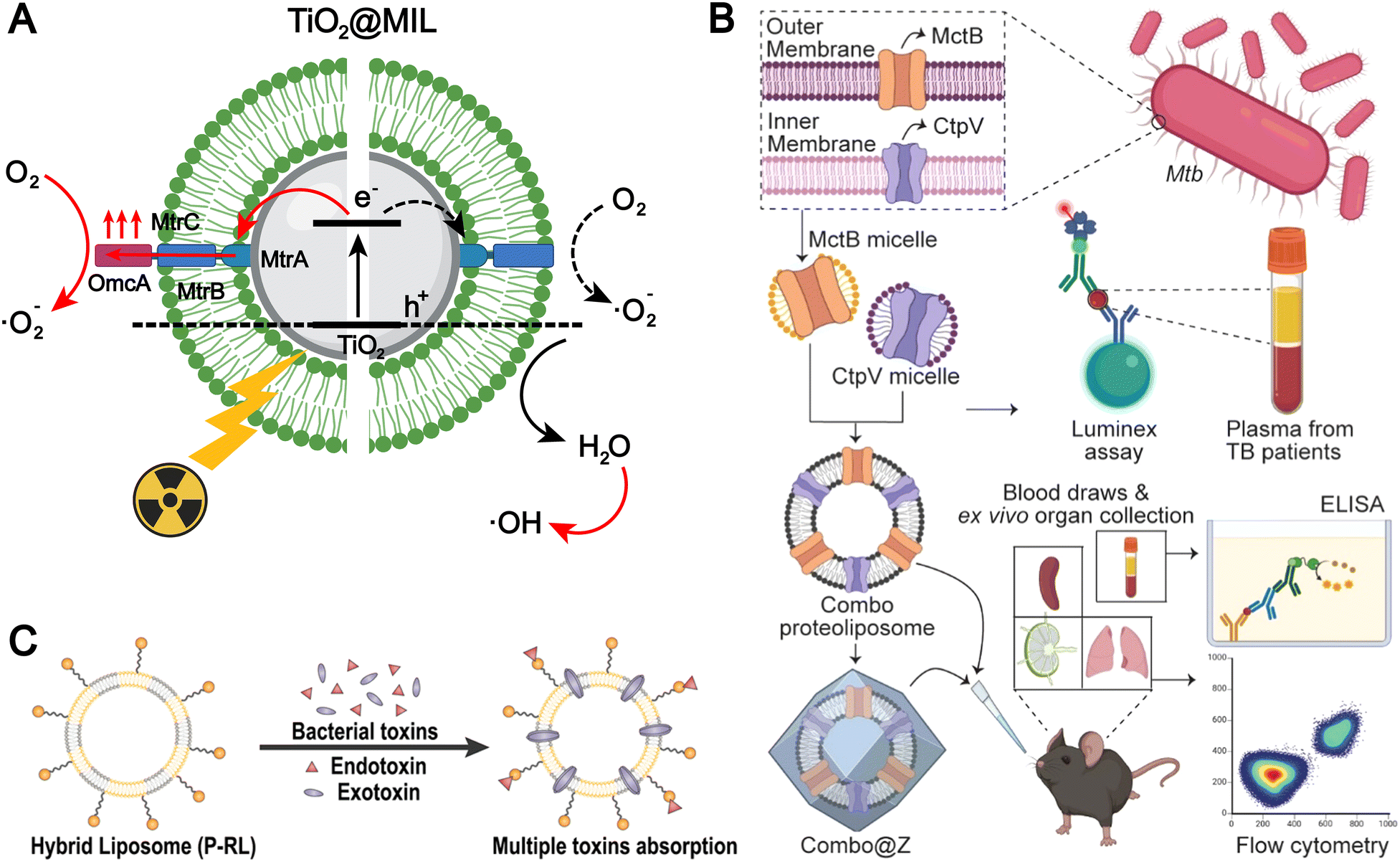 | Fig. 6 (A) The illustrated mechanisms of the X-ray-induced EET biomimicking for electron transport from the TiO2 core across the MtrCAB–OmcA-based electron channel to the surrounding oxygen for O2˙−. Adapted from ref. 38 and created with BioRender.com. (B) Utilization of membrane proteins as tuberculosis (TB) antigens for the development of a biomimetic liposomal vaccine. Reproduced from ref. 37 with permission from the American Chemical Society, copyright (2024). (C) Schematic illustration of P-RL. P-RL is fabricated by the fusion of polymyxin B-modified lipids and the red blood cell membrane. Benefiting from the two materials, the P-RL is capable of simultaneously absorbing endotoxins and exotoxins that are secreted by E. coli. Reproduced from ref. 95 with permission from the American Chemical Society, copyright (2021). | ||