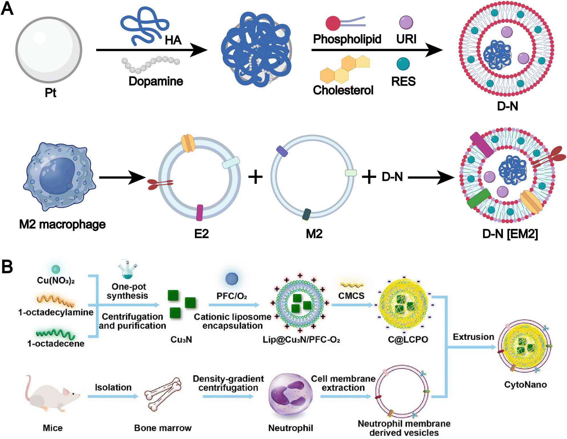 | Fig. 7 (A) Synthesis pathway of PtHD, D-N and D-N[EM2]. Adapted from ref. 35 and created with BioRender.com. (B) Design and synthesis of CytoNano. This elegantly engineered composite features a cationic liposome loaded with copper-nitride nanoparticles and oxygen-rich perfluorocarbon (Lip@Cu3N/PFC-O2), all wrapped in a sophisticated coating of neutrophil membrane and acid-responsive carboxymethylcellulose (CMCS, with an isoelectric point of 6.5). Its fabrication is accomplished through a detailed, integrative self-assembly process, meticulously combining these elements to target cancer cells precisely and effectively. Reproduced from ref. 109 with permission from the American Chemical Society, copyright (2024). | ||