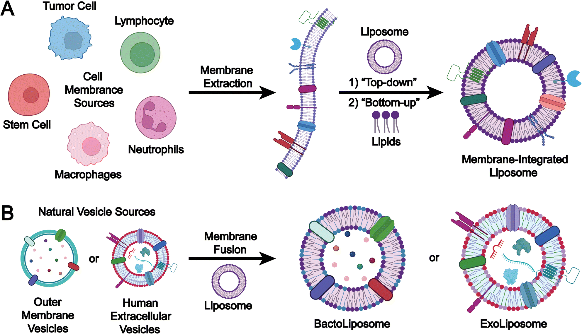 The “Bottom-up” and “Top-down” approaches are fundamentally contrasting strategies for biomimetic liposome fabrication. The “Bottom-up” method utilizes lipid molecules, cholesterol, and cell membrane components at the molecular level to self-assemble, gradually forming biomimetic liposomes. This method enables precise control over the particle size, membrane structure, and drug loading capacity of biomimetic liposomes, thereby producing high-performance drug-loaded liposomes and enhancing their delivery efficiency. The development of bottom-up approaches has facilitated the synthesis of bioinspired delivery systems through surface functionalization with ligands and molecules capable of binding to the receptors of specific target cells.