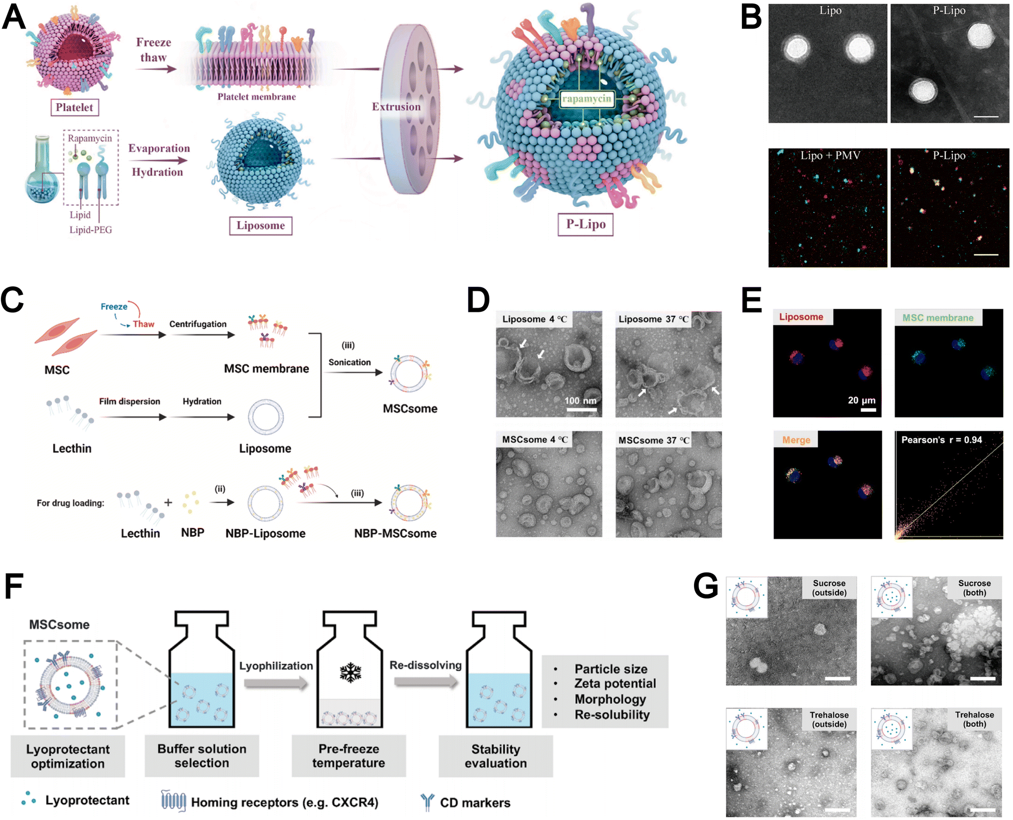 | Fig. 9 (A) Schematic diagram of the synthetic process of platelet membranes-hybrid biomimetic liposomes P-Lipo. (B) Top: Transmission electron micrographs (TEMs) of liposomes and P-Lipo. Down: Confocal laser scanning microscope (CLSM) images of either a mixture of liposome and platelet membrane vesicle (PMV) or P-Lipo (red: liposome, green: PMV). Reproduced from ref. 100 with permission from Elsevier, copyright (2020). (C) Schematic diagram of the three-step preparation of liposome and mesenchymal stem cell-biomimetic liposomes (MSCsome). (D) Representative TEM images of Liposome and MSCsome after storing at 4 °C and 37 °C for 7 days, respectively. (E) CLSM images of DiO and DiD-double labeled MSCsome in different channels with Pearson's r analysis of the colocalization of DiD and DiO. Red signal, DiD-labeled Liposome (DiD-Liposome); green signal, DiO-labeled MSC membrane; blue signal, 4′,6-diamidino-2-phenylindole (DAPI)-labeled nuclei. Reproduced from ref. 135 with permission from Elsevier, copyright (2024). F) Illustration to demonstrate the optimization of the lyophilization of MSCsomes. (G) TEM images of MSCsomes pre-frozen at −20 °C and protected with sucrose and trehalose in the out-layer only, as well as MSCsomes protected with sucrose and trehalose in both the out-layer and the inner-layer. Reproduced from ref. 136 with permission from Wiley-VCH, copyright (2024). | ||