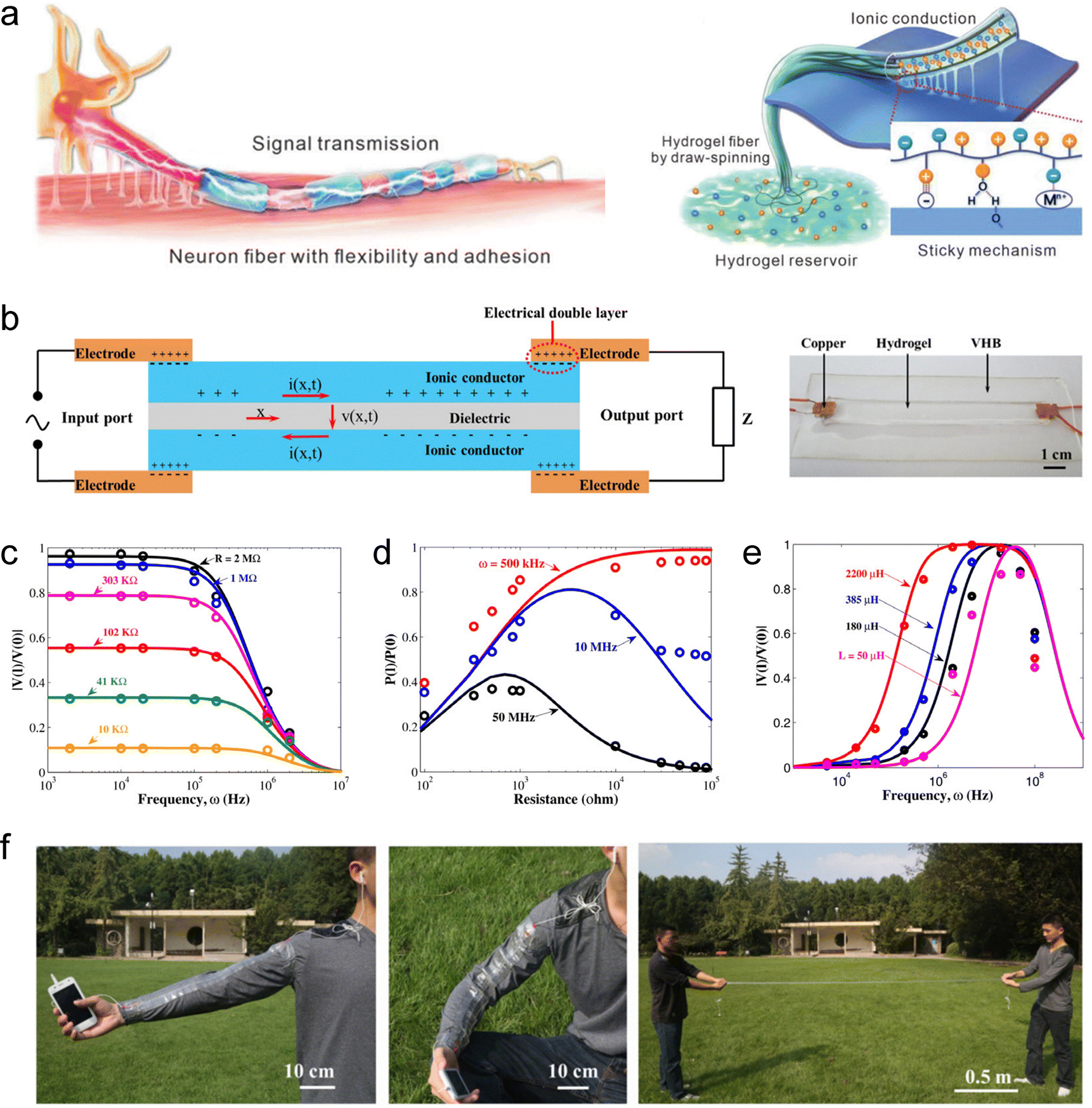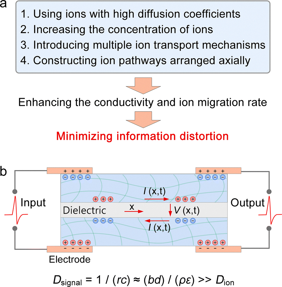 | | Fig. 4 Construction strategies for artificial axons. (a) Methods to enhance conductivity and ion mobility in SICs. (b) Architecture of SIC-based artificial axons, in which the signal diffusivity (Dsignal), characterizing the signal transmission speed along the ionic cable (unit: m2 s−1), greatly exceeds the ion diffusivity (Dion) in SICs. Reproduced with permission from ref. 169. Copyright@2015, Elsevier. | |