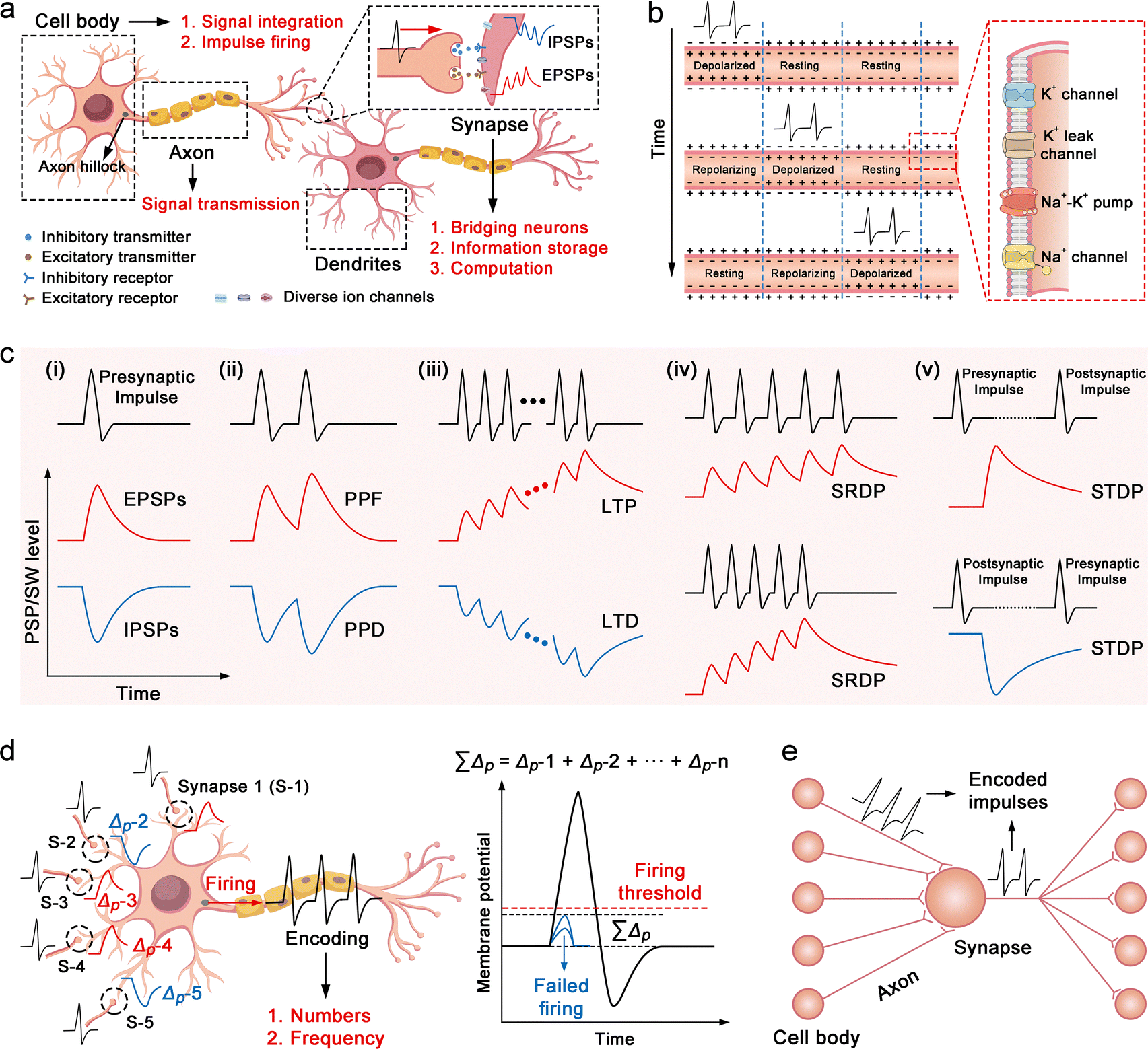 | | Fig. 2 Neural components and their electrochemical characteristics. (a) Functional schematic of biological axons, synapses, and neurons. (b) Rapid and non-attenuated propagation of ionic action potentials along axons. (c) Synaptic signal characteristics, including EPSPs/IPSPs (c-i), PPF/PPD (c-ii), LTP/LTD (c-iii), SRDP (c-iv), and STDP (c-v). (d) Electrical behavior of neurons, highlighting signal integration, threshold-triggered spiking, and frequency-coded information transmission. (e) Parallel computing paradigm of neural networks, demonstrating how interconnected neurons collaboratively process information. | |