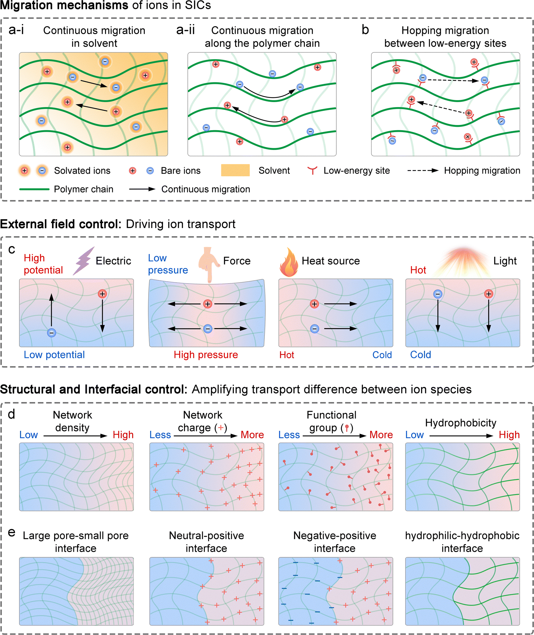 As previously discussed, ion transport in SICs is strongly influenced by factors including ion concentration, temperature, electric field, solvent flow, and interactions between ions and the polymer network. This indicates that ion transport can be controlled through external fields, structural modifications to SICs, and the introduction of specialized interfaces.