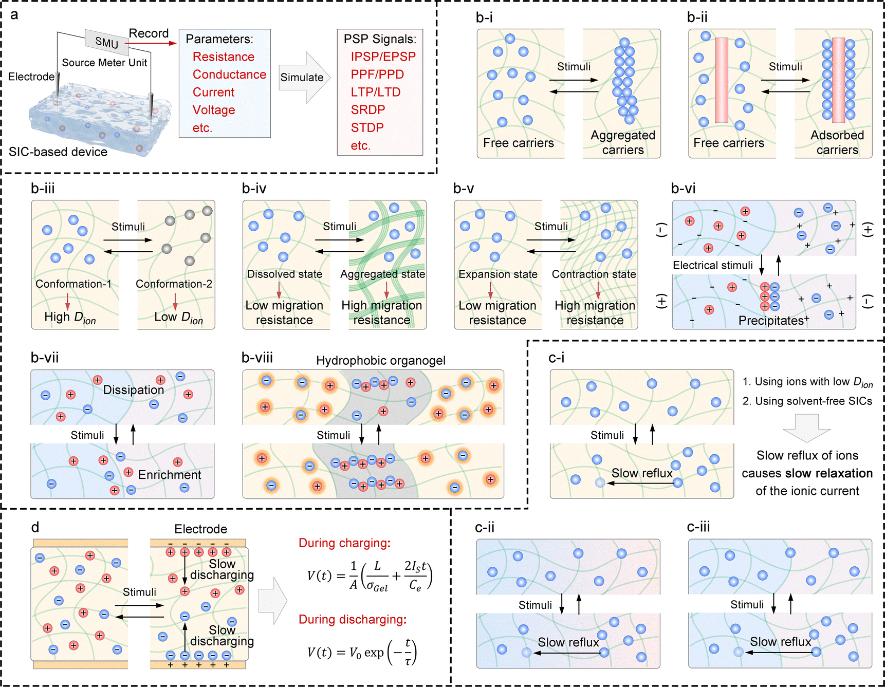 To achieve ionic current with memory (i.e., relaxation) behavior in SIC-based devices, the key is to reduce the migration rate of ion species. When external stimuli induce asynchronous transport of cations and anions, a transient ionic current is generated. Upon removal of the stimulus, ions undergo back-diffusion driven by the chemical potential, leading to a gradual decay of the current. By slowing ion migration, the relaxation time of the ionic current is prolonged, enabling memory-like behavior (Fig. 5(c)). Based on this, some general strategies are listed below: