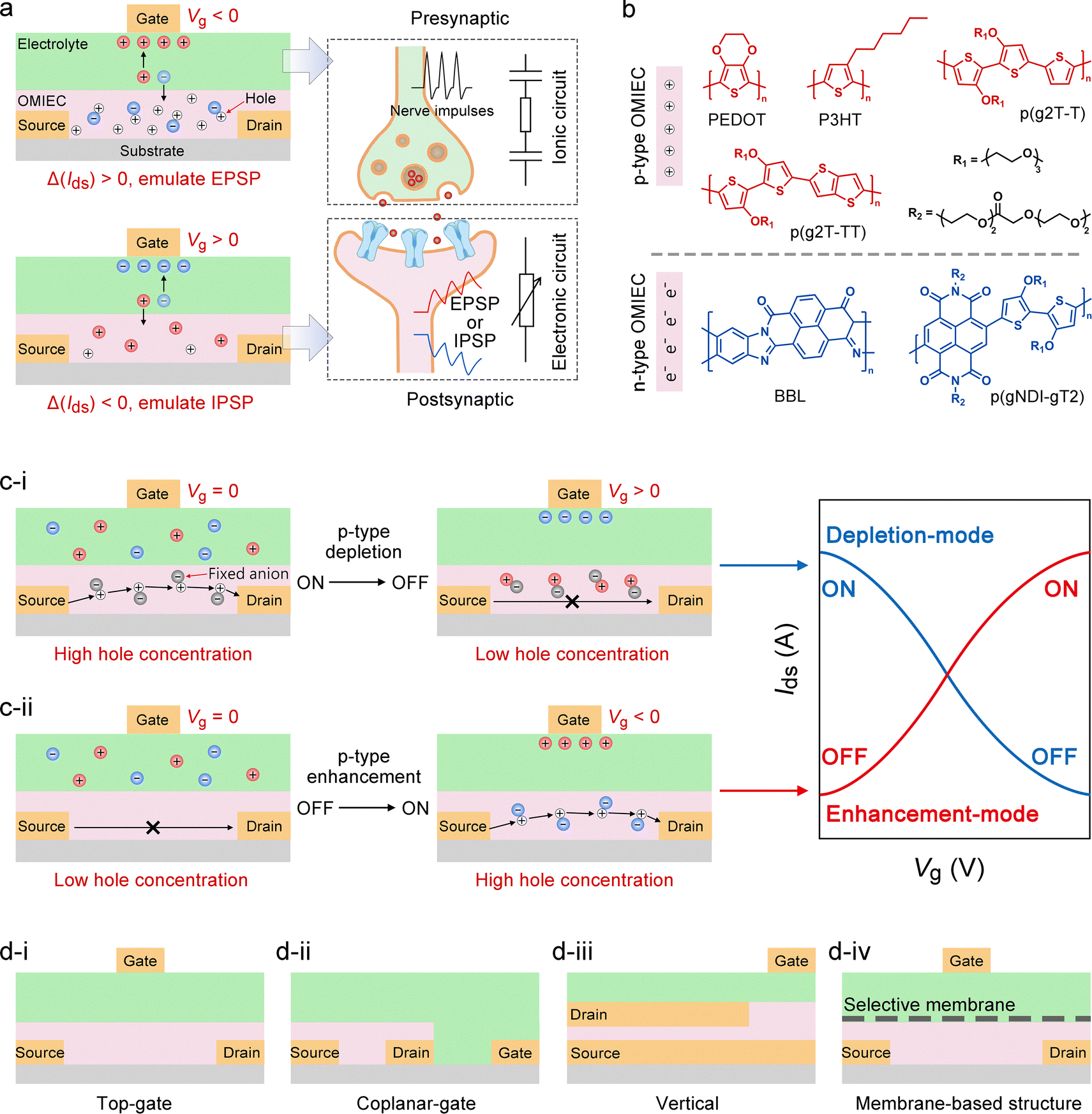 Regarding the channel materials, OECTs are broadly categorized into hole-dominated p-type and electron-dominated n-type devices, each presenting distinct operating mechanisms and design considerations. Representative p-type materials include PEDOT,182–185 P3HT,186–189 and alcohol- or polyether-functionalized thiophene-based conjugated polymers (e.g., p(g2T-T), p(g2T-TT)),190–192 which generally offer high hole mobility, excellent ionic compatibility, and large volumetric capacitance. By modulating the gate voltage to drive ion injection, the hole concentration within the channel can be precisely controlled, enabling reversible doping and dedoping (Fig. 6(b)). N-Type materials, in contrast, have historically been challenged by limited electronic stability and side reactions under aqueous conditions, but notable advances have been achieved recently.193 Typical examples include BBL,194–196 naphthalene diimide (NDI)-based conjugated polymers,197–199 and various donor–acceptor polymers.88 Incorporating strong electron-accepting units such as bithiophene imide (BTI), diketopyrrolopyrrole (DPP), and azaisoindigo (AIID) can lower the LUMO level, enhancing electron affinity and environmental stability.200 In n-type devices, a negative gate voltage drives cations into the channel, forming electrostatically neutral pairs with reduced high-electron–density states, thereby increasing electronic conductivity (Fig. 6(b)). Overall, p-type OECTs are particularly advantageous for high transconductance, signal amplification, and mechanical stretchability, whereas the advancement of n-type OECTs is critical for enabling complementary logic circuits,201 signal amplification,202 ambipolar synaptic networks,203 and more complex brain-inspired circuitry.117 In terms of operation, OECTs are typically categorized into depletion and enhancement (accumulation) modes. Depletion-mode devices exhibit a high-conductivity (ON) state at zero gate bias, and the applied gate voltage triggers dedoping or an opposite chemical transition, leading to a decrease in conductance (OFF) (Fig. 6(c-i)).204 In contrast, enhancement-mode devices exhibit a low-conductivity (OFF) state at zero gate bias, where the application of a gate voltage with an appropriate polarity drives ion injection into the channel layer, induces electrochemical doping, and consequently increases the channel conductance (ON) (Fig. 6(c-ii)).205 It should be emphasized that the volatile (short-term memory) or non-volatile (long-term memory) characteristics of OECTs are not determined by the operation mode itself.