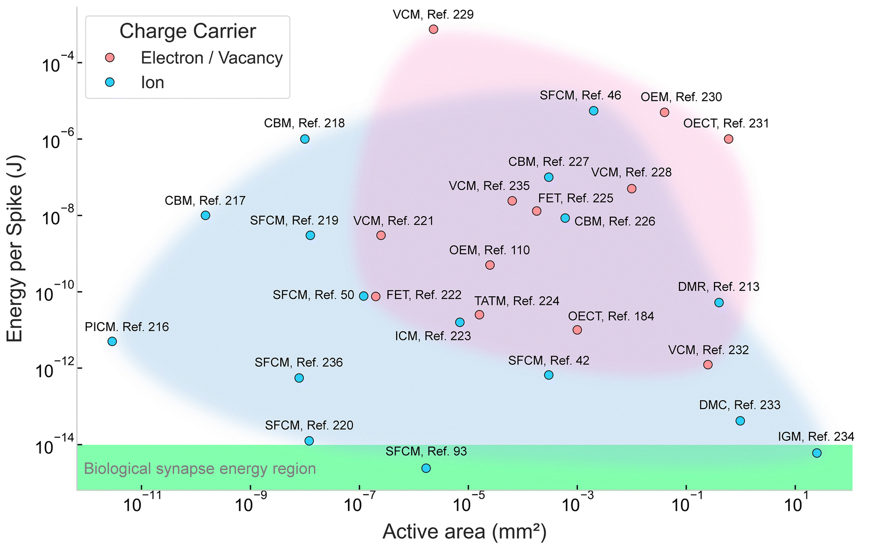 Artificial axons, neurons, and synapses, collectively known as neuromorphic devices, form the core functional units of brain-like intelligent hardware systems. These devices respectively enable signal transmission,25 signal integration and encoding,26 information storage,27 and computation.28 Assemblies of neuromorphic devices are expected to process information as efficiently and with minimal energy consumption as the human brain,29 while enabling seamless communication with biological systems.30 As of now, the neuromorphic devices that have reached a relatively mature stage in terms of both research and applications are based on solid-state electronics, which use electrons/holes as charge carriers. In contrast, the human brain, a naturally evolved liquid–electrolyte system, relies on the controlled transport of ions to execute advanced functions such as perception, memory, learning, and computation.31 Over the past decade, this fundamental distinction has prompted researchers to reconsider the foundational design of neuromorphic devices, driving the development of devices that use ions as charge carriers, namely neuromorphic iontronic devices (NIDs), toward systems that more closely emulate biological characteristics.32–35 It is widely believed that such ion-based systems offer several advantages, including bio-signal compatibility,36 low energy consumption,37 and resistance to electromagnetic interference,38 among others.