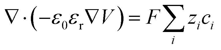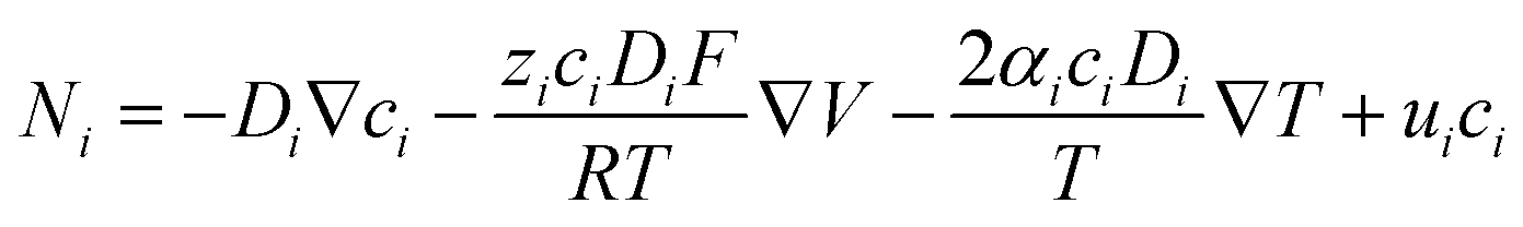 Here, ci and Ni represent the concentration and molar flux of ion species i, respectively. The effective medium is a component that has good compatibility with ions, containing solvents and polymer chains. This compatibility arises from van der Waals forces, hydrogen bonding, dipole–dipole interactions, and other non-covalent interactions.125 It is generally believed that when there is good interaction between the ions and the matrix of SICs, the ions primarily undergo continuous transport, such as in ionic hydrogels, ionic organogels, and ionogels.81 In SICs with low ion concentrations (covering levels observed in biological systems), continuous ion transport can be accurately described by the Poisson–Nernst–Planck (PNP) theory, governed by the following two key equations:126| |  | (2) |
