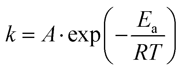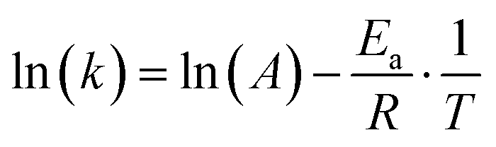 where k denotes the diffusion coefficient (or ionic conductivity), A is the reference diffusion coefficient (or ionic conductivity) at temperature T, and Ea is the activation energy. This equation can be converted to a linear form:| |  | (5) |