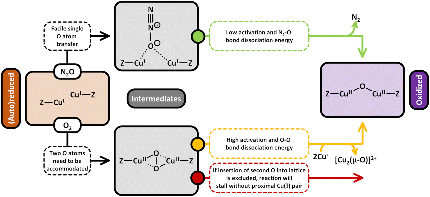 The preferential formation of [Cu2(µ-O)]2+ via treatment of Cu–zeolites in N2O instead of O2 also becomes apparent when comparing the generation mechanisms of the dimeric Cu-oxo site in the presence of the two oxidants (eqn (5.1) and (4.7)–(4.10)). In the case of N2O, the reaction proceeds via a simple two-electron redox process and involves the direct transfer of a single O moiety to two Cu(I) ions as well as the simultaneous release of N2.9,19,51,52,95,124,149,158 On the contrary, the O–O bond cleavage occurring throughout [Cu2(µ-O)]2+ evolution in O2 requires that the second O moiety must be accommodated either within the zeolite lattice or at a nearby Cu(I) pair.147,179 Keeping in mind that the former process is characterized by an excessively high true activation energy of 250 kJ mol−1 (see Section 4.2.2), it is reasonable to assume that the transformation of a proximal Cu(I) pair into another oxygenated Cu(II) center by the liberated O group is preferred. However, this implies that the development of [Cu2(µ-O)]2+ in O2 might be inhibited in the absence of neighboring Cu(I) ions, as there is no place to host the second O moiety. Activation in N2O thus enables the generation of isolated [Cu2(µ-O)]2+, which might not be possible in the case of O2 treatment. Scheme 12 illustrates the distinct formation mechanism of [Cu2(µ-O)]2+ in either O2 or N2O and emphasizes the necessity of a location to accommodate the liberated O group in the case of Cu–zeolite activation by O2.