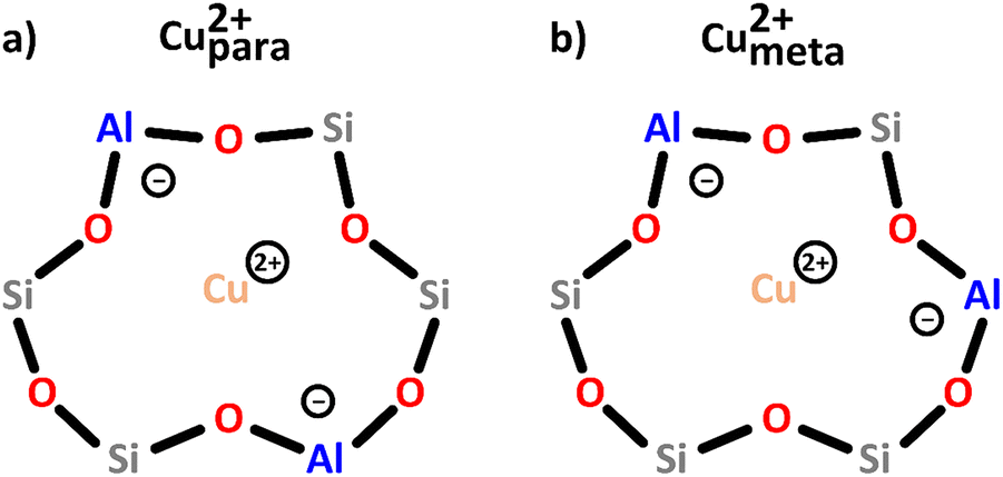 | Scheme 2 Bare monomeric Cu2+ charge-balanced by two Al T-sites positioned in either the para (a) or meta (b) arrangement. Color code: Al = blue, Si = grey, framework O = red, Cu = orange. | ||