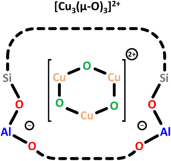 | Scheme 5 Trimeric [Cu3(µ-O)3]2+ charge-balanced by two Al T-sites. Color code: Al = blue, Si = grey, framework O = red, Cu = orange, extra-framework O = green. | ||