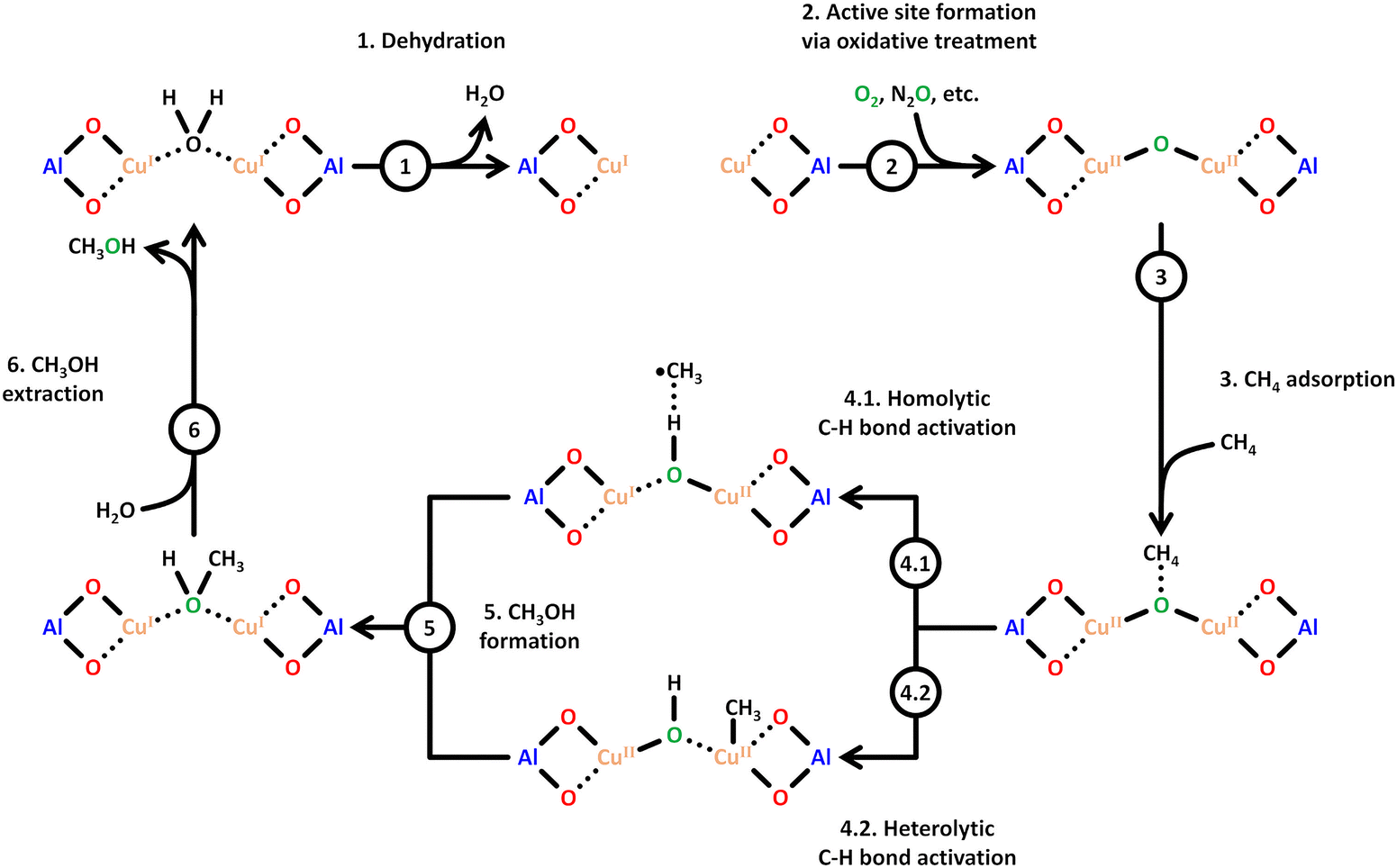 | Scheme 6 Proposed mechanism of CH4 hydroxylation by [Cu2(µ-O)]2+. Starting from a reduced state after H2O-assisted CH3OH extraction, the redox cycle consists of: dehydration (1), active site formation via exposure to an oxidizing agent such as O2 or N2O (2), CH4 adsorption at the Cu(II) active site (3), C–H bond activation via either homolytic or heterolytic (4.1 or 4.2) C–H bond activation, CH3OH formation (5), and CH3OH extraction with H2O (6). Dotted bonds correspond to dative interactions. Color code: Al = blue, framework O = red, Cu = orange, extra-framework O = green. Adapted from ref. 78 with permission from the American Chemical Society (Copyright 2018). | ||
