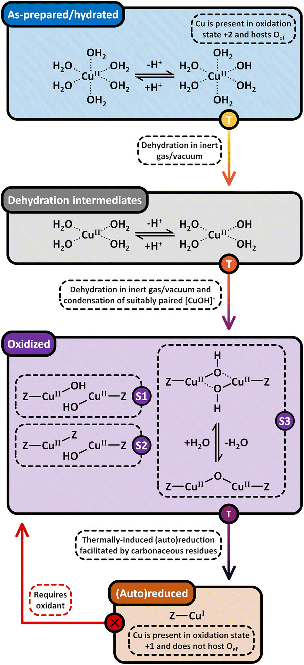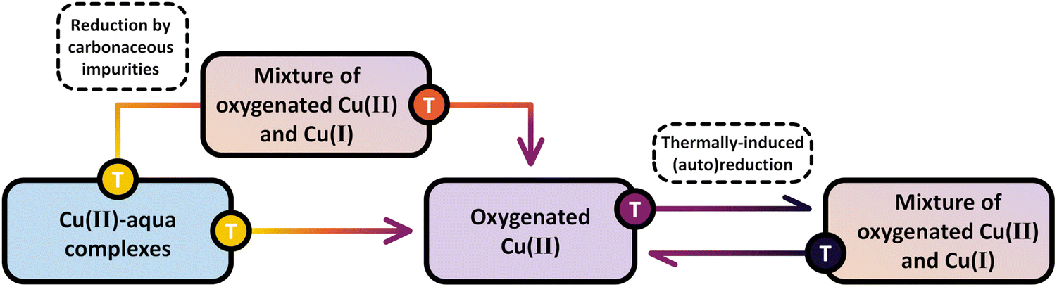 Scheme 8 highlights the differences between the reduction of Cu(II) by carbonaceous residues and the thermally-induced (auto)reduction of Cu(II) during calcination of Cu–zeolites at progressively increasing temperatures.