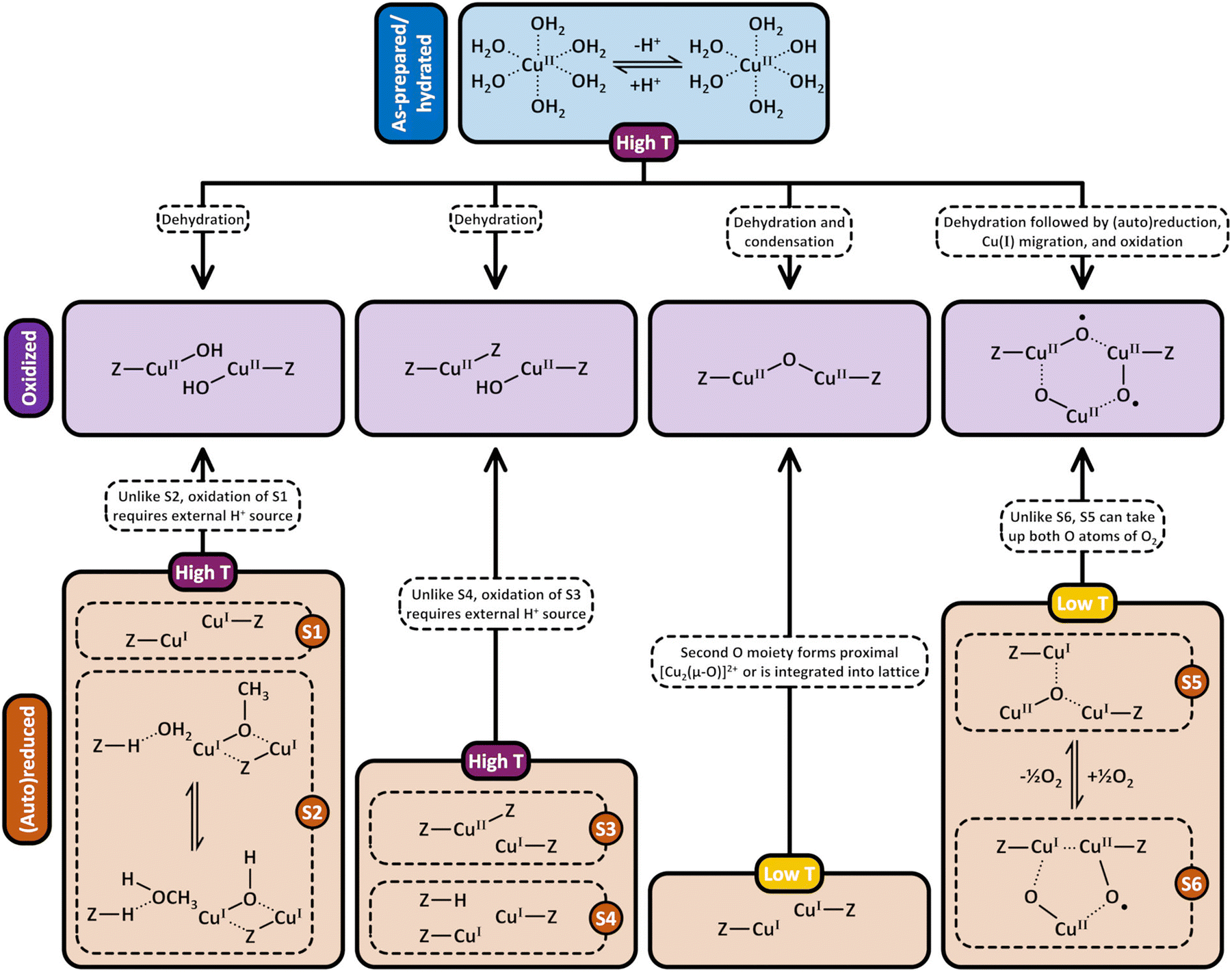62,65,108–111 have been demonstrated to participate in CH4 partial oxidation. The facile formation of Cu2+/[CuOH]+ as well as [CuOH]+/[CuOH]+ via dehydration of Cu(II)-aqua complexes is illustrated in Scheme 7.