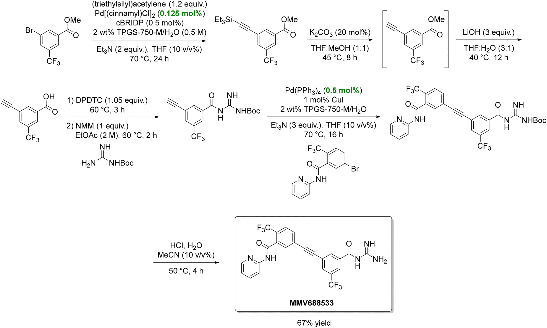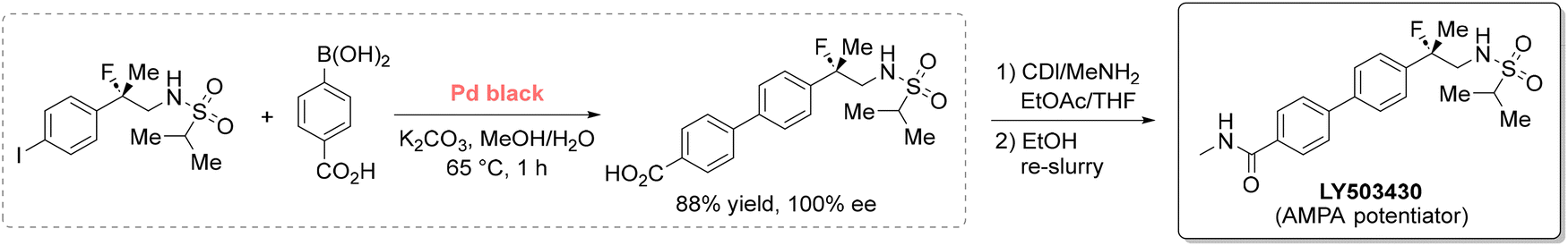Nonetheless, researchers at Eli Lilly employed a Suzuki–Miyaura coupling to synthesize the key intermediate to LY503430, a potential treatment for Parkinson's disease (Scheme 21).342 The archetypal homogeneous Pd(OAc)2/PPh3 system delivered sub-optimal yields (∼70%) and a purity below 95%. Substituting the homogeneous catalyst with Pd black afforded the single enantiomer in 88% yield on a 500 g scale. This heterogeneous approach also leached minimal (3–8 ppm) Pd amounts leading to a product purity of 99.8%. It should be noted that the researchers did not examine the recyclability of the catalytic system. Also in this case, a holistic perspective could lead to additional improvements in the future: in fact, while the use of Pd black is very efficient, the use of CDI in the subsequent step still produces 2 equiv. of imidazole waste.