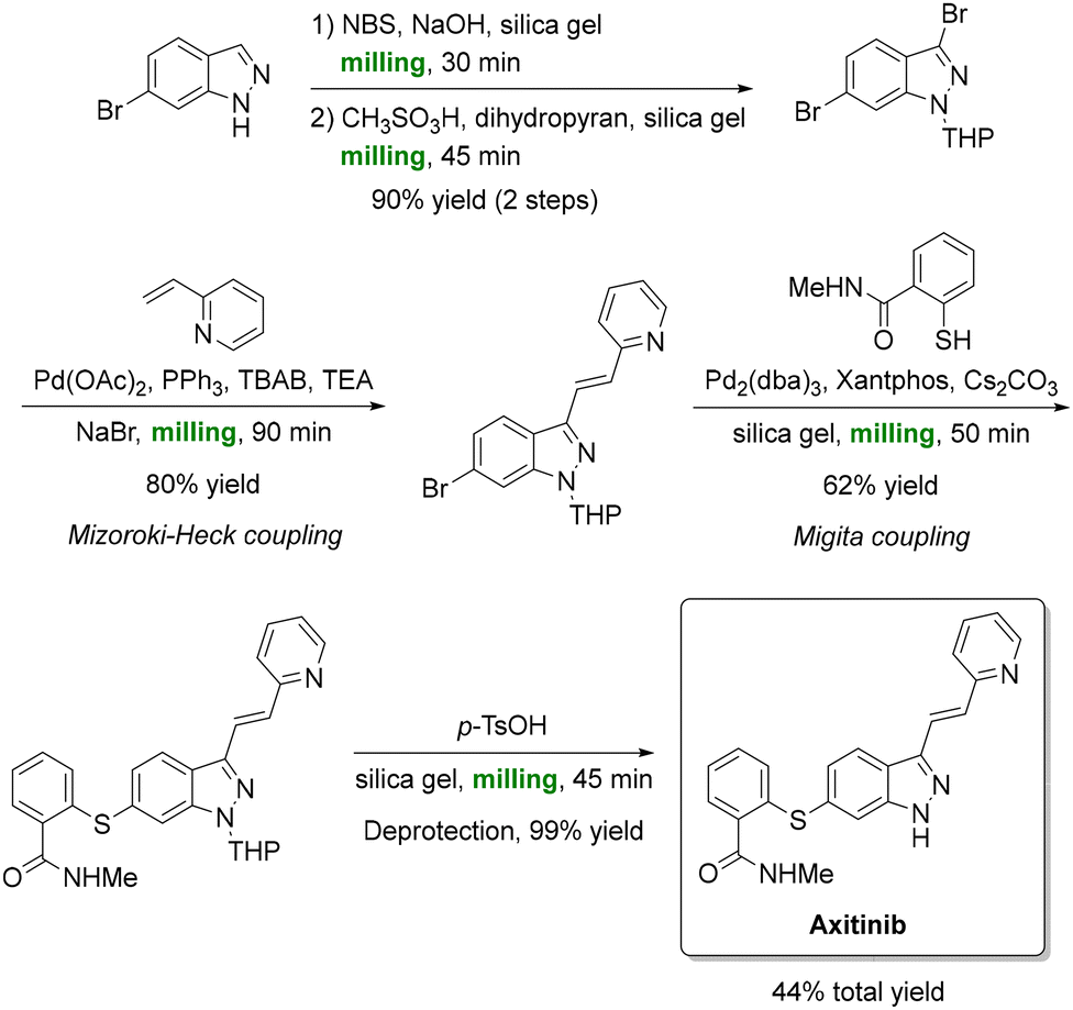 The constraints associated with product purification alongside solvent recycling make it more practical, and in many cases more effective, to reduce or eliminate solvent use altogether, thereby circumventing the need for downstream recovery. A range of strategies are currently being explored to achieve this objective. One of the most straightforward involves replacing traditional organic solvents, such as dichloromethane (DCM), tetrahydrofuran (THF), dimethylformamide (DMF), and dimethyl sulfoxide (DMSO), with greener alternatives. These substitutions can be integrated into both established and new synthetic routes. More transformative strategies aim to eliminate organic solvents entirely by using supercritical fluids, particularly supercritical CO2, or aqueous micellar media. In this context, mechanochemistry is also gaining traction as a promising route to solvent-free synthesis, although questions remain regarding safety, scalability, and product purification. In Section 2.2, we outline solvent reduction strategies in order of increasing sustainability benefit.
