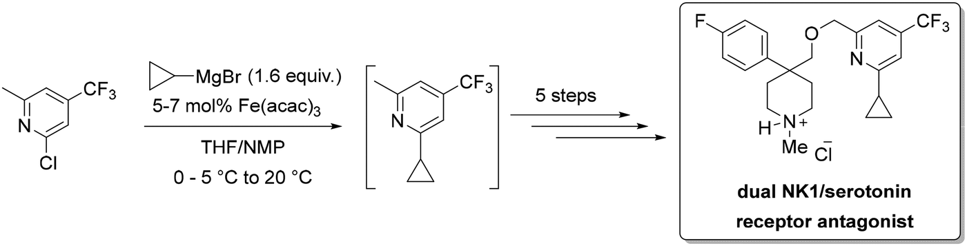 For example, despite palladium's dominance in cross-couplings, this metal has known drawbacks, such as slow oxidative addition with C(sp3)–electrophiles, lower reactivity toward C–O bonds, and a propensity for β-hydride elimination in alkyl–palladium intermediates.308 By contrast, nickel's heightened nucleophilicity facilitates the activation of less reactive C–O bonds, and its alkyl–nickel species undergo β-hydride elimination more slowly, making nickel superior for C(sp3)–X cross-couplings as demonstrated in recent literature.308–310 Analogously, iron can provide comparable benefits, provided more strongly activated nucleophiles such as organomagnesium or organozinc reagents are utilized.311,312 A compelling demonstration is Bristol-Myers Squibb's synthesis of a dual NK1/serotonin receptor antagonist, where an inexpensive 5–7 mol% Fe(acac)3 catalyst efficiently coupled a chloropyridine to cyclopropyl magnesium bromide, affording yields of 94–96% (Scheme 17).313