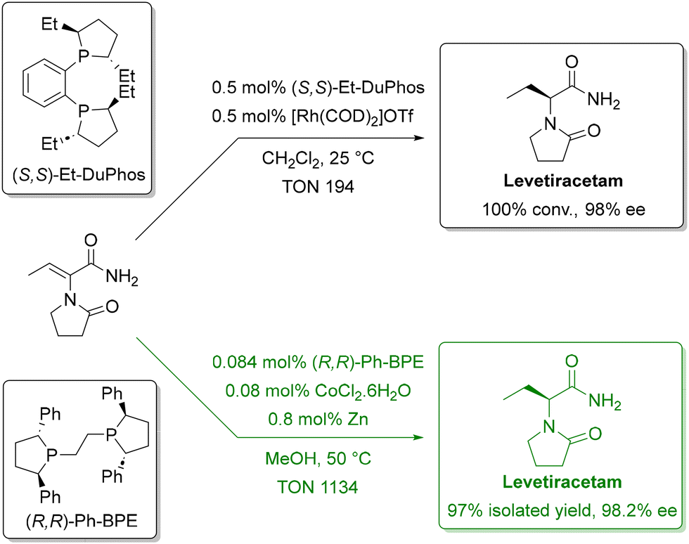 | Scheme 18 Asymmetric hydrogenation of the tri-substituted alkene in dehydro-levetiracetam with a rhodium (black) or cobalt catalyst (green). Replacing Rh with a cobalt-based catalyst paired with (R,R)-Ph-BPE enables the same key reduction in MeOH at only 0.08 mol% Co, achieving higher TON and excellent yield and ee. This example highlights how modern ligand design allows base metals such as Co to match or surpass the performance of PGM catalysts. Adapted from ref. 317. | ||