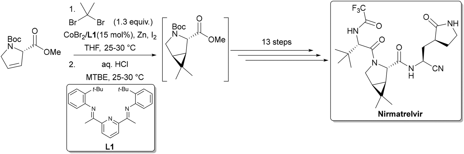 | Scheme 19 Cobalt-catalyzed cyclopropanation step in the synthesis of nirmatrelvir. Adapted from ref. 320. | ||