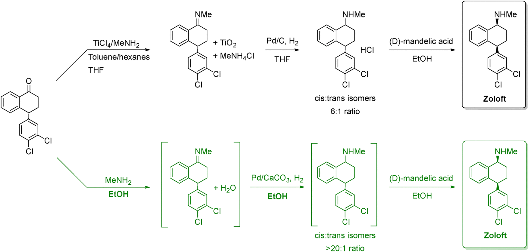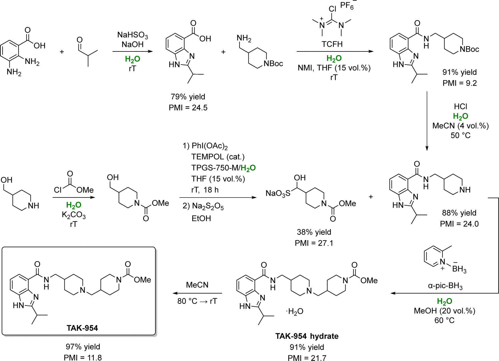 A similar strategy was devised for montelukast sodium (Singulair), a widely prescribed treatment for allergies and asthma.386 By means of directed evolution, a keto reductase (KRED) was developed to asymmetrically reduce the ketone precursor into its (S)-alcohol, the key intermediate of Singulair. The engineered KRED tolerated elevated temperatures (40–45 °C) and up to 70% v/v water-miscible organic cosolvent (2-propanol), conditions necessary to dissolve the hydrophobic precursor. Relative to the traditional moisture-sensitive, corrosive, and atom-inefficient diisopinocampheylborane approach, the KRED route lowered PMI and organic solvent consumption by approximately 30% and 25%, respectively.