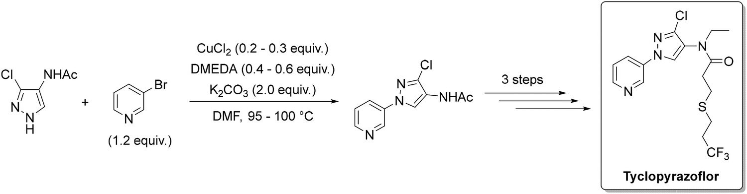 Another example of base metals delivering remarkable reactivity is copper-mediated Ullmann-type cross-couplings.286 Although discovered by Ullmann in 1901 and by no means novel, these transformations remain highly relevant to this day.322 Numerous industrial applications have been reported, including an Ullmann C–N coupling for the synthesis of tyclopyrazoflor, an insecticide.323 Corteva's initial [3+2] cyclization strategy raised concerns over safety, scalability, and cost.324 Three modes of conducting the reaction were explored: early-, mid-, and late-stage Ullmann coupling, ultimately selecting the mid-stage one for scale-up. In this pivotal step, a bromopyridine was coupled to a pyrazole intermediate in 70–75% yield using 3 mol% CuCl and 14 mol% N,N-dimethylethylenediamine. Demonstrating the robustness of the overall five-step route, the protocol was scaled to above 50 kg (Scheme 20). Potential room for improvement still exists for future development, as DMF, an obvious candidate for substitution, was the solvent of choice for this campaign.