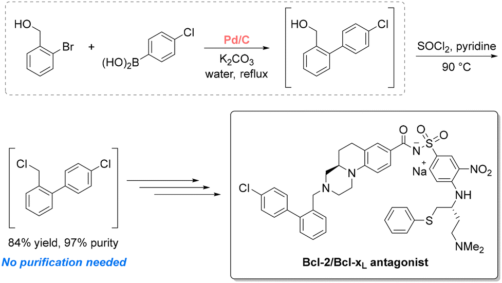 Meanwhile, Oril Industrie executed a multikilogram-scale synthesis of a potent Bcl-2/Bcl-xL antagonist, which promotes apoptosis in cancer cells (Scheme 22).343 Due to low purity and intellectual property concerns over the catalyst phosphine ligand, a new approach was sought. After screening catalysts with varying oxidation states, Pd loadings, and water content, Pd/C type 394 delivered the key benzyl chloride intermediate in 97% purity and boosted its yield by 30% compared to the original route. Importantly, the heterogeneous catalyst allowed the Suzuki–Miyaura coupling to be telescoped with the subsequent chlorination step, meaning mutagenic benzyl chloride did not have to be handled in powder form. In this case, the long-term stability, recyclability, or palladium leaching levels were not investigated.
