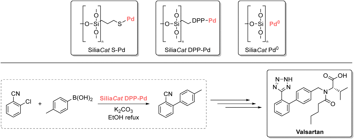 A compelling example comes from SiliCycle who introduced a family of organically modified silica-supported Pd catalysts (Scheme 23, top), suitable for Suzuki–Miyaura, Mizoroki–Heck, Negishi, and Sonogashira reactions.346,347 The SiliaCat catalysts can be filtered and reused up to five times with Pd and Si leaching below 1 ppm and 50 ppm, respectively. However, their stability during successive catalytic cycles is highly substrate dependent. For example, in a 100 g Suzuki–Miyaura step toward the synthesis of antihypertensive Valsartan (Scheme 23, bottom), the SiliaCat DPP-Pd catalyst initially performed excellently (100% conversion – 98% yield) but suffered significant activity loss in the second (88% conversion), third (57% conversion), and fourth (30% conversion) cycle.348