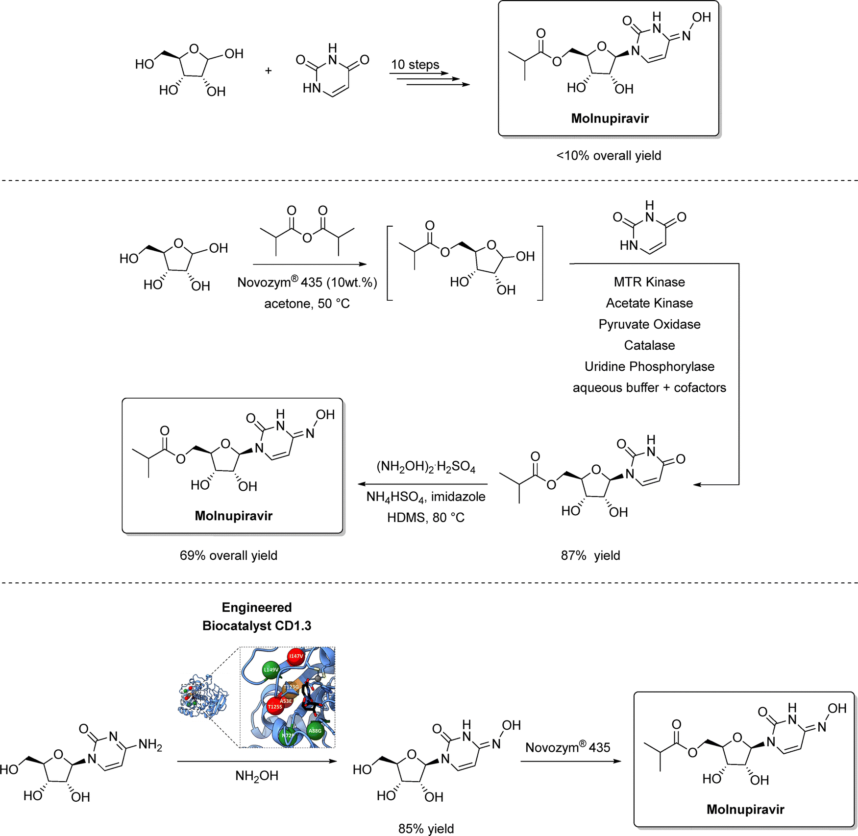 | Scheme 24 Synthesis of the COVID-19 antiviral molnupiravir via original route (top), biocatalytic cascade (middle), and engineered cytidine deaminase (bottom). Comparison of three synthetic approaches to COVID-19 antiviral molnupiravir. The original chemical route (top) required 10 steps and delivered the API in <10% overall yield. A subsequent chemoenzymatic strategy (middle) dramatically improved efficiency by combining Novozym® 435–mediated esterification with an enzymatic cascade involving MTR kinase, acetate kinase, pyruvate oxidase, catalase, and uridine phosphorylase, enabling concise access to the key intermediate and raising the overall yield to 69%. The most advanced version (bottom) employs an engineered biocatalyst, CD1.3, to achieve direct and high-yielding conversion of the nucleoside precursor with hydroxylamine, providing molnupiravir in 85% yield. Adapted from ref. 402 and 403, respectively. | ||