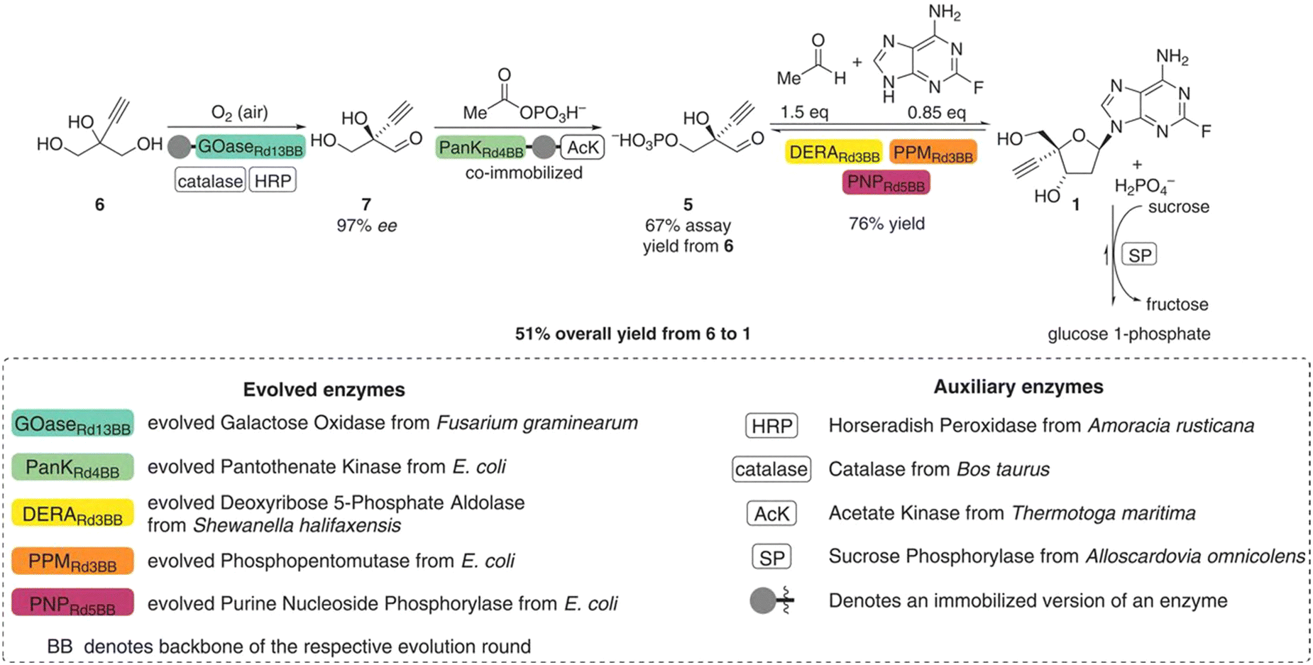 Similarly, the antiretroviral islatravir was synthesized via a multienzymatic cascade involving five engineered enzymes and four auxiliary enzymes (Scheme 25).404 The process starts with 2-ethynylglycerol oxidation by a galactose oxidase variant, with the resulting hydrogen peroxide byproduct decomposed by catalase and horseradish peroxidase. Next, a pantothenate kinase variant regioselectively phosphorylates the sensitive aldehyde intermediate using ATP, which is recycled from acetyl phosphate through acetate kinase. This phosphorylated aldehyde undergoes an aldol reaction with acetaldehyde, catalyzed by a deoxyribose 5-phosphate aldolase variant. A phosphopentomutase variant shifts the phosphate group from position 5 to 1. Finally, a purine nucleoside phosphorylase variant couples 2-fluoroadenine to the deoxyribose derivative. To drive product formation, sucrose phosphorylase removes phosphate from the last three steps. This aqueous approach achieved a 51% yield with no intermediate isolation, while improving atom economy and halving the total number of steps.399,404