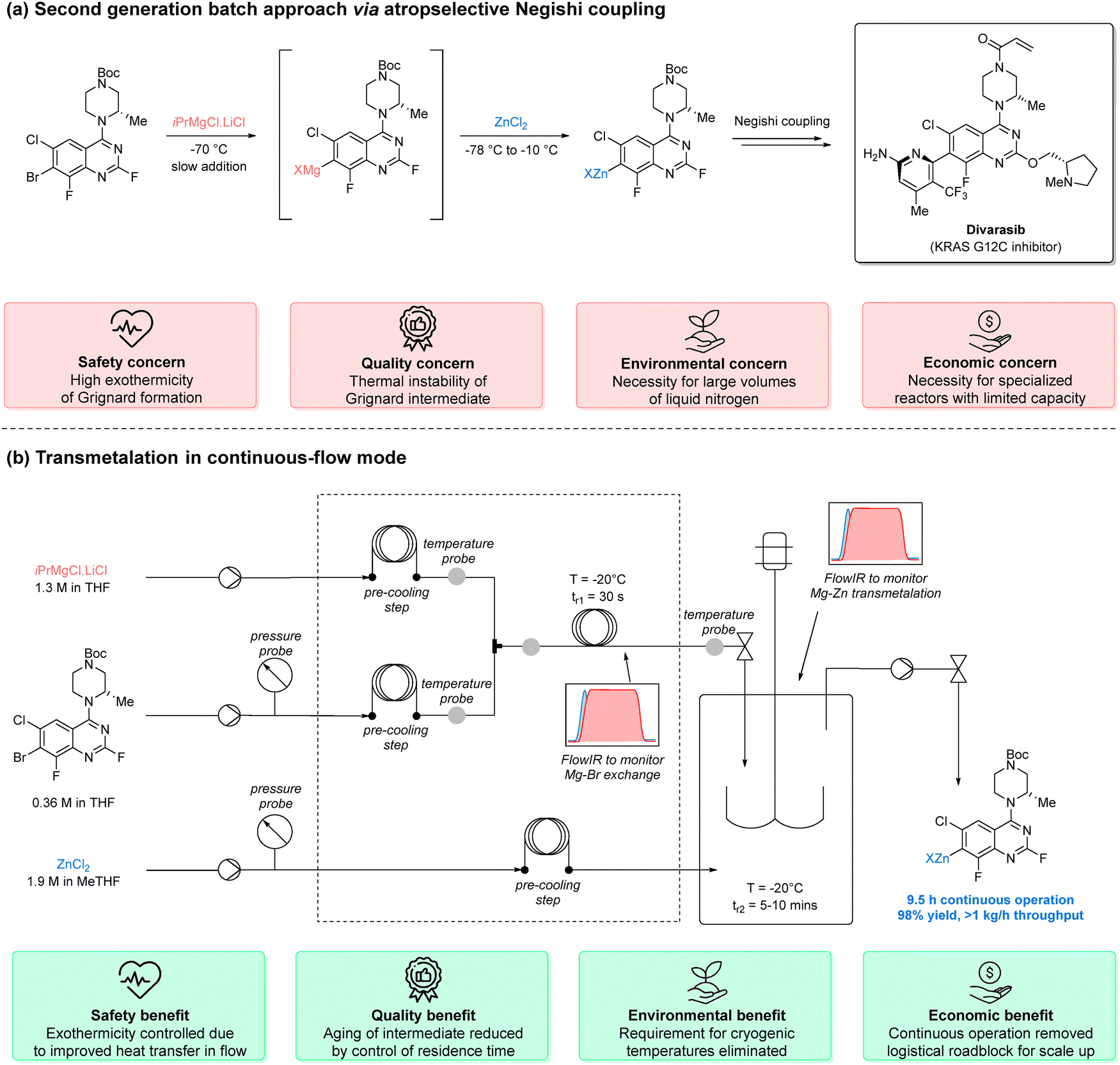 Continuous-flow technology has gained recognition for the safe and efficient generation of hazardous and highly reactive metalated intermediates.415,416 A noteworthy example was reported in 2024 by Genentech and Hoffmann-La Roche, who developed a continuous-flow synthesis of quinazoline organozinc 3.430 This species is a late-stage intermediate to divarasib (Scheme 26), a cancer therapeutic at advanced clinical trials. The primary synthetic challenge lies in establishing an atropisomeric axis between the aminopyridine moiety and quinazoline core through a Negishi reaction. In the second-generation synthetic route, the traditional batch process involves metal–halogen exchange of bromoquinazoline 1 with i-PrMgCl·LiCl at −70 °C, followed by transmetalation with ZnCl2 at 10 °C. Although this method enabled production of up to 125 kg of product 2, it suffered several limitations: firstly, not only is the exchange highly exothermic, but the resultant Grignard intermediate also decomposes above −60 °C, posing quality risks from potential thermal hotspots; secondly, further scale-up would require specialized low-capacity cryogenic reactors and large volumes of liquid nitrogen, an environmental and logistical challenge.