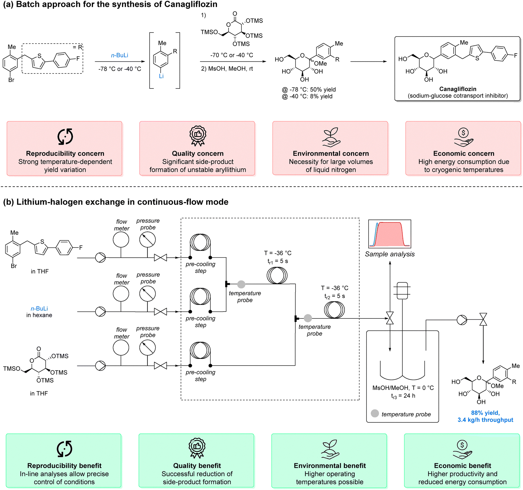 | Scheme 27 Batch vs. continuous-flow approach to obtain a key intermediate of canagliflozin. The batch approach (a) requires deep cryogenic temperatures, suffers from strong temperature-dependent variability, and produces unstable arylium intermediates, leading to reproducibility, quality, environmental, and economic concerns. The continuous-flow alternative (b) enables precise control of residence time and temperature, ensuring reproducible organolithium formation and clean downstream coupling. Adapted from ref. 431. | ||