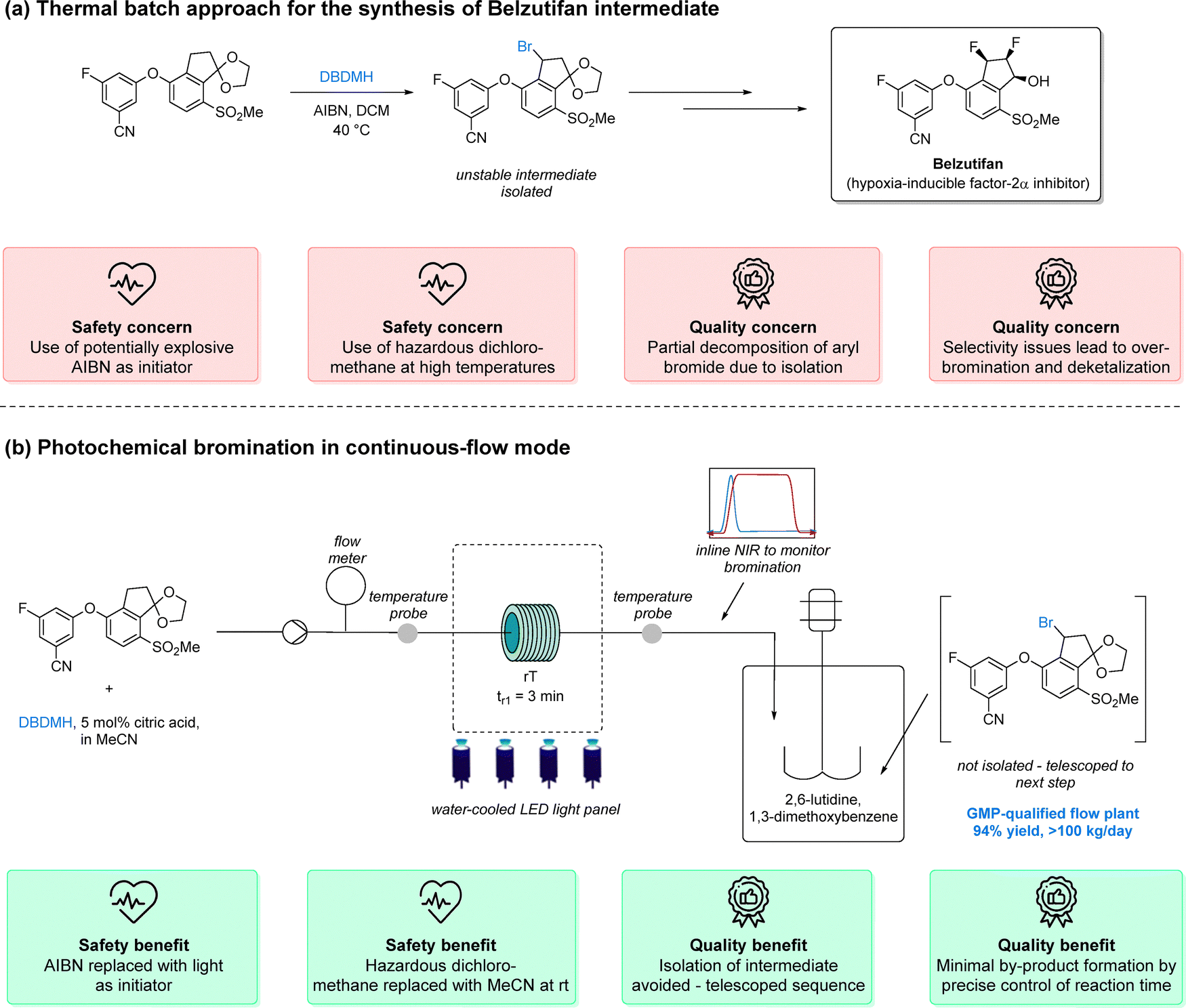 | Scheme 28 Comparison of batch vs. continuous-flow approach to obtain a key intermediate of belzutifan. The traditional batch process (a) requires azobisisobutyronitrile (AIBN) as a potentially explosive radical initiator and uses dichloromethane at elevated temperature, leading to safety risks, intermediate instability, and quality issues such as overbromination and debromination. The photochemical flow process (b) replaces AIBN with light, eliminates hazardous DCM in favor of acetonitrile (MeCN) at room temperature, and integrates real-time NIR monitoring to precisely control the bromination. This also enables telescoped processing, and delivers a GMP-ready intermediate with high assay yield and scalable productivity. In the figure, DBDMH stands for 1,3-dibromo-5,5-dimethylhydantoin. Adapted from ref. 440. | ||